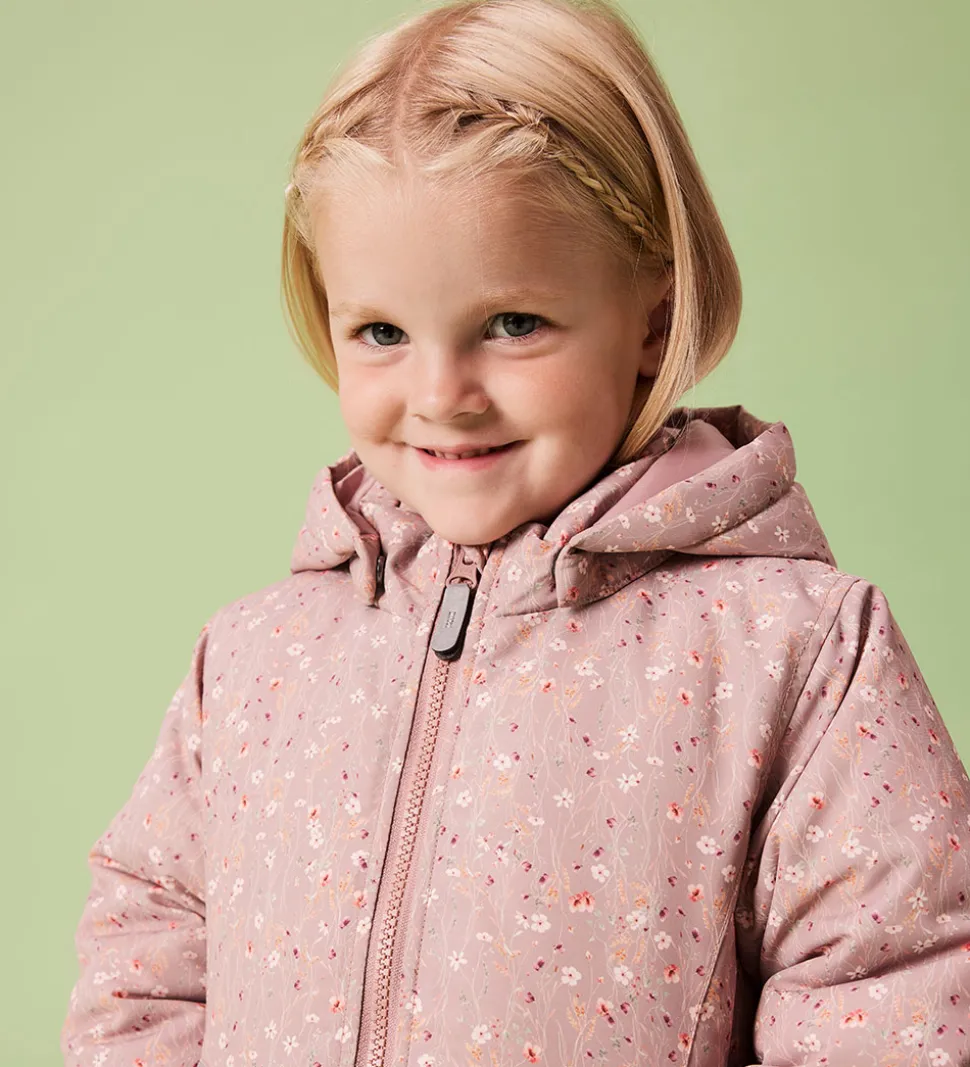 Smart Name It vinterjakke i en afdæmpet rosa nuance og med et smukt blomstermønster over det hele, som skaber et elegant udtryk.