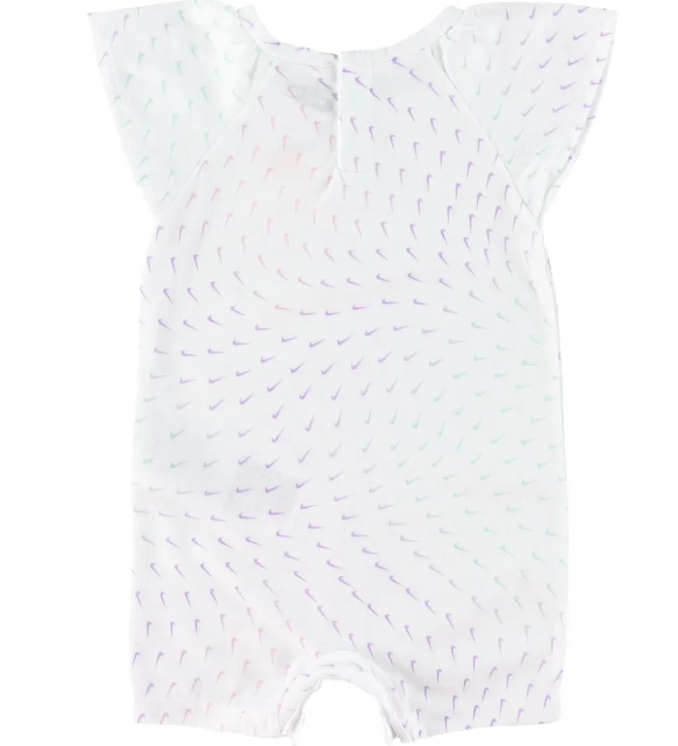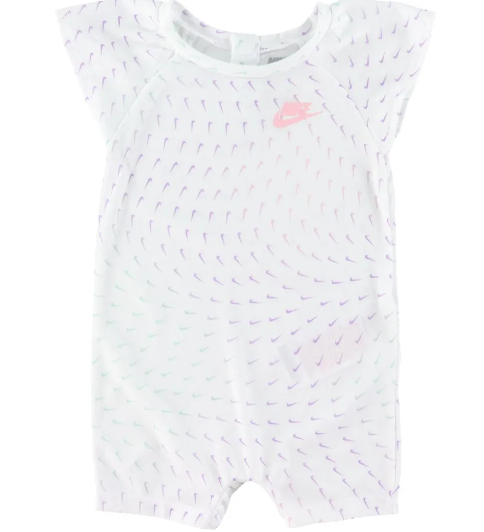 Skøn Nike sommerdragt i hvid med et alloverprint af små Nike logoer i lilla, rosa og mint. På venstre bryst er der et rosa logoprint.