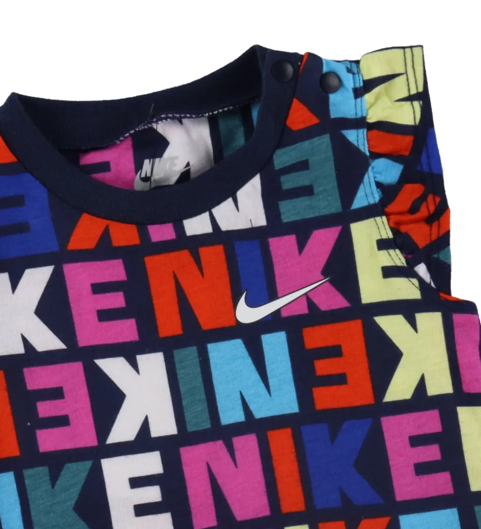 Flot Nike sommerdragt i navy, med “NIKE” printet over det hele i et hav af farver. På venstre bryst er et småt logoprint i hvid, og i skuldrene er der korte flæser.