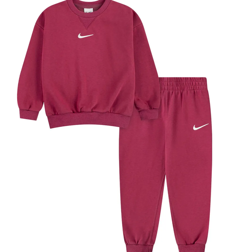 Praktisk Nike sweatsæt i en mørk rosa farve med et diskret logoprint på både sweatshirt og sweatpants. Hele sættet udstråler enkelhed med et moderne look. Sweatshirten har lange ærmer med brede ribkanter ved håndleddene, og den karakteristiske Nike swoosh på brystet. Sweatpantsene har elastik i taljen og en bred ribkant ved anklerne. Begge dele er lavet med blødt børstet bomuld på indersiden.