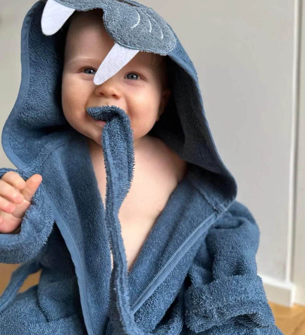 Lækker Nørgaard Madsens badekåbe i blå med en hætte i et hvalrosdesign med støvtænder og broderede træk.