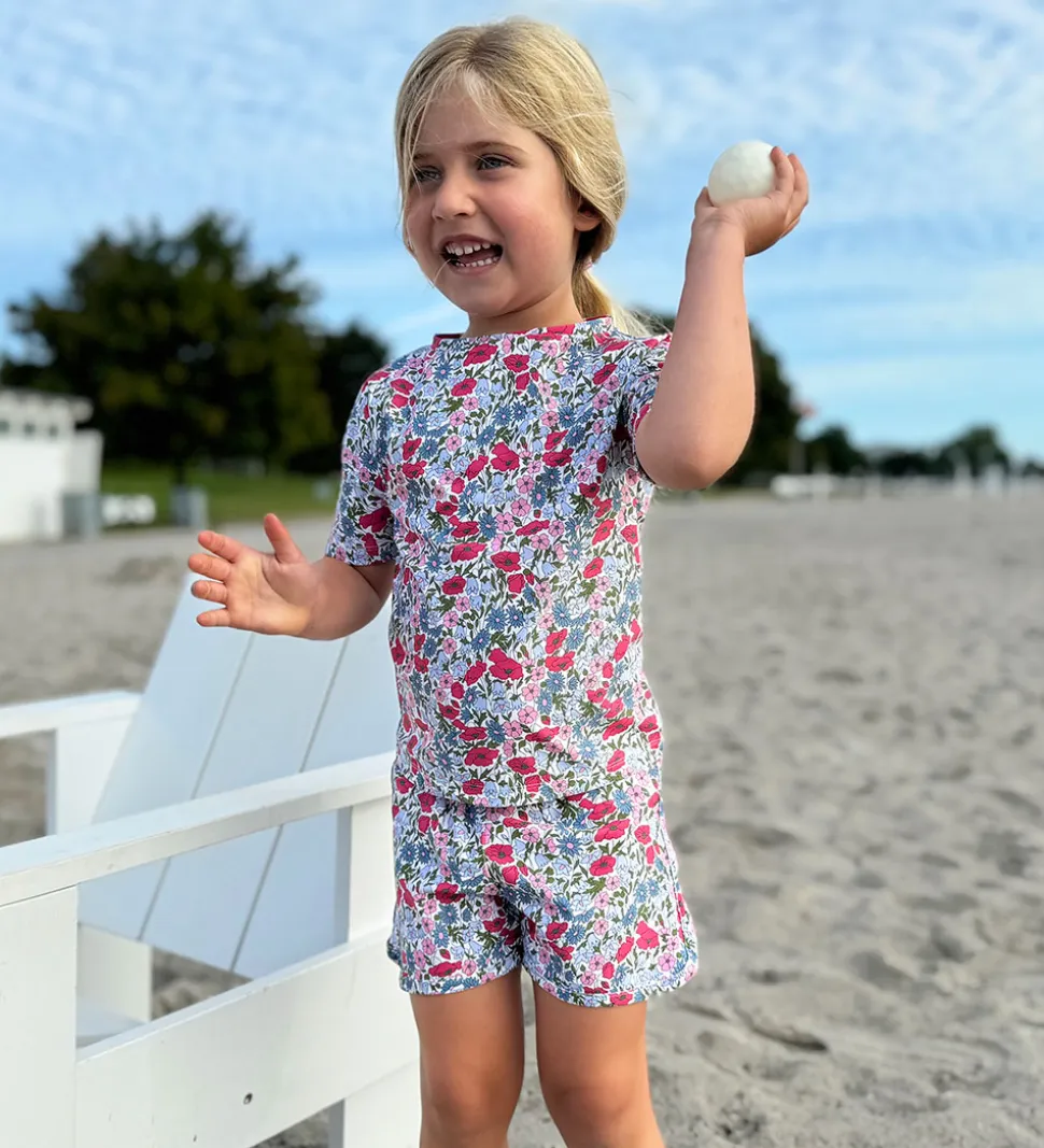 Smart Petit Crabe badebluse i hvid med et allover blomsterprint i rosa og blå nuancer.