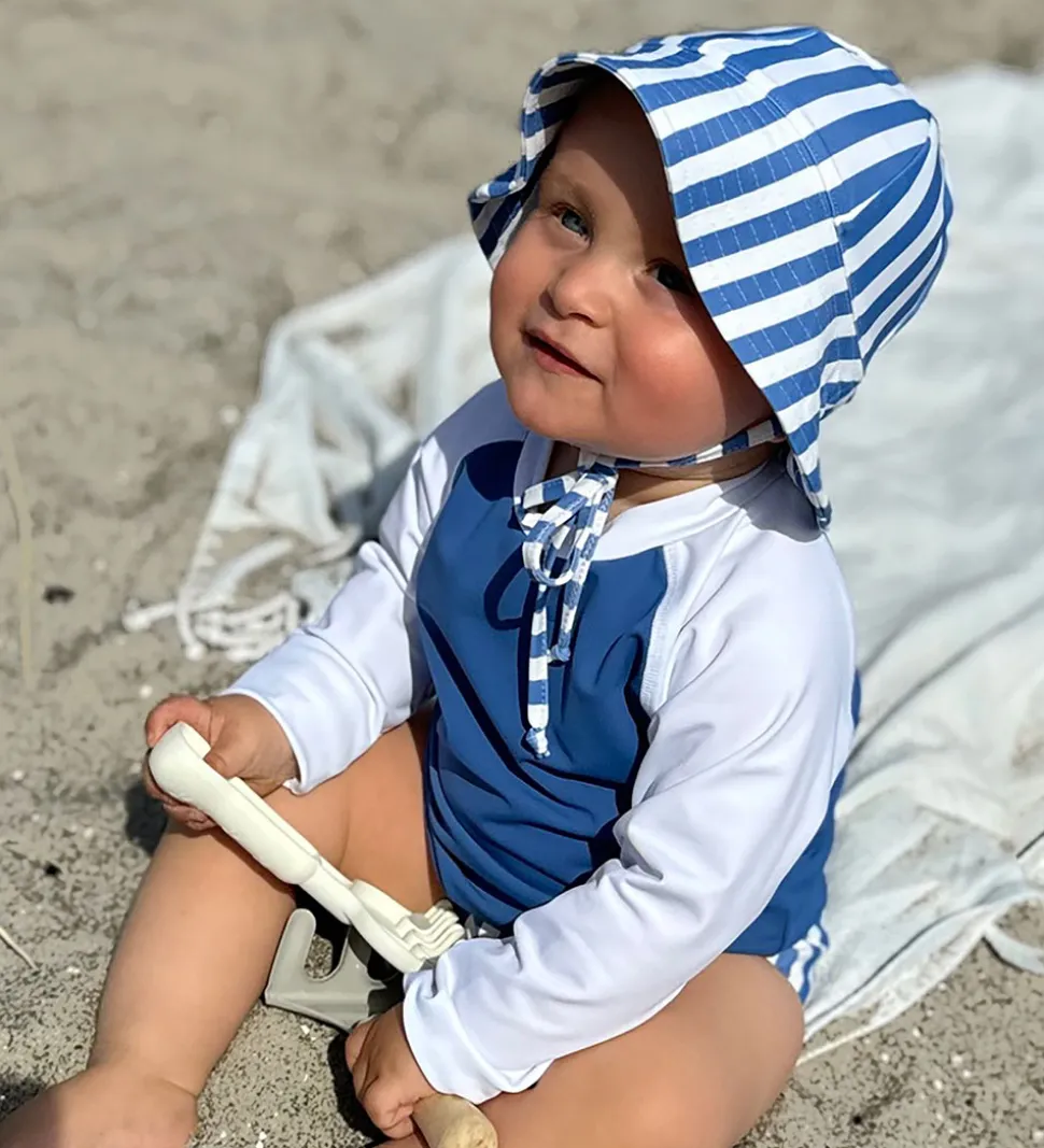 Skøn Petit Crabe badehat med lodrette striber i hvid og lyseblå.