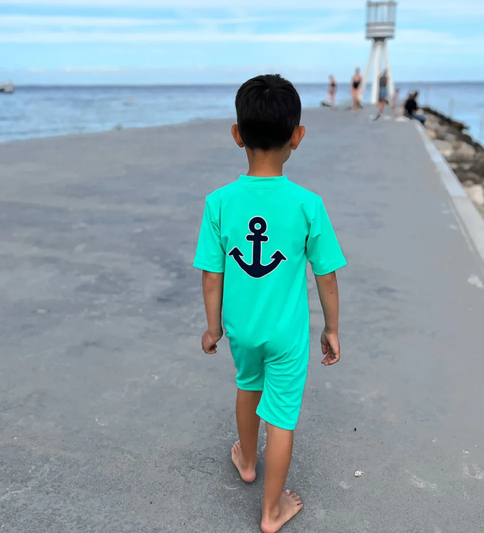 Smart Petit Crabe badeheldragt i en frisk grøn med et stort anker på ryggen.
