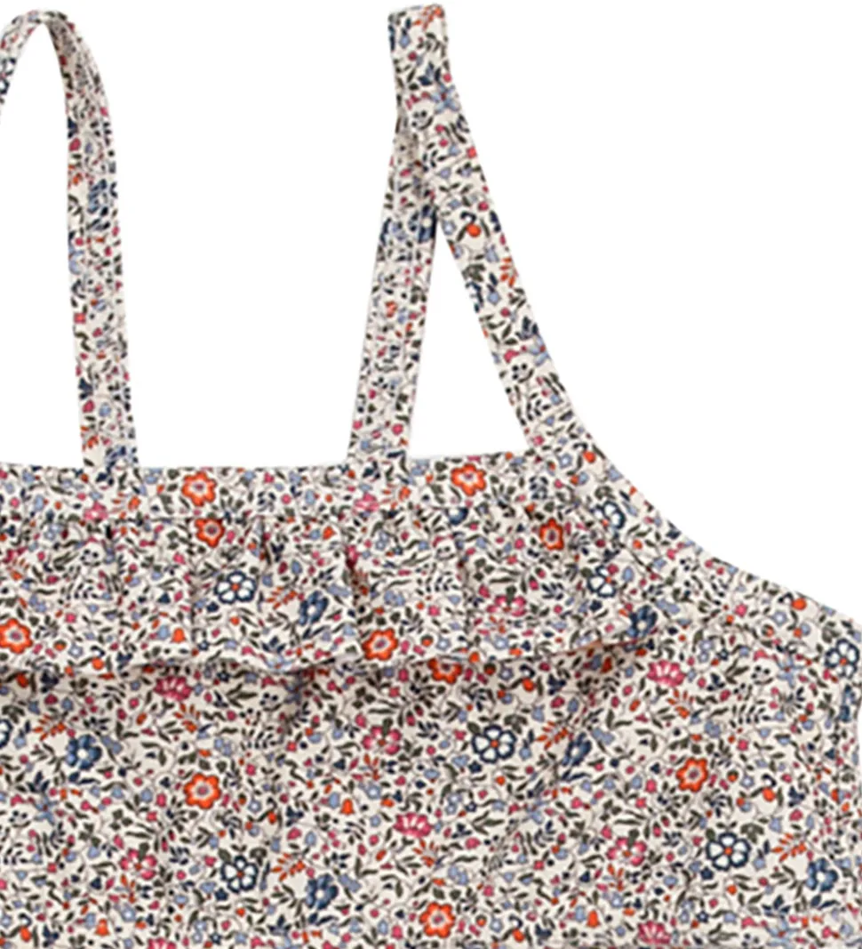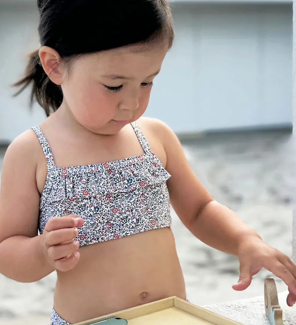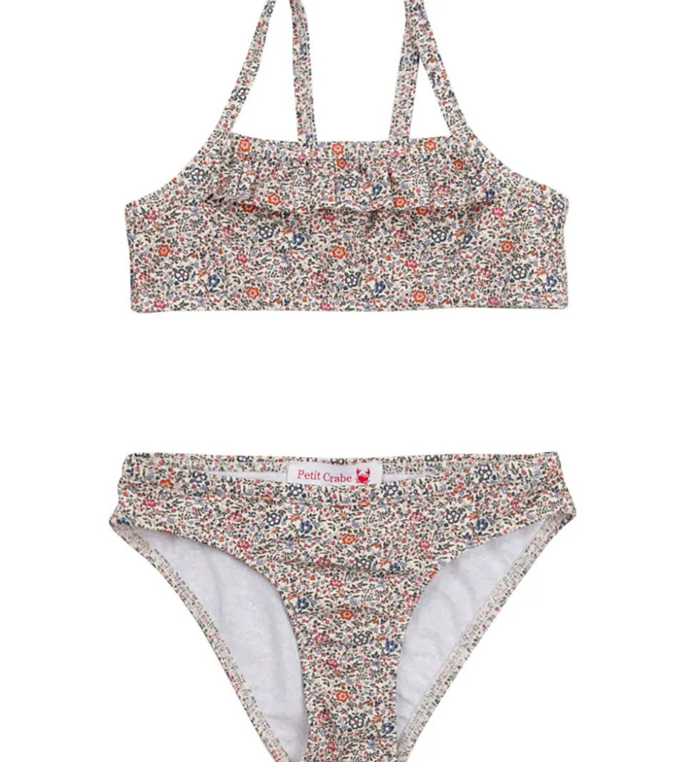 Petit Crabe bikinien består af en overdel med en smalle stropper, der krydser hinanden på ryggen, og en underdel i et klassisk snit. Bikinitoppen har en sød flæse, og langs alle åbninger er der smalle, elastiske kanter.