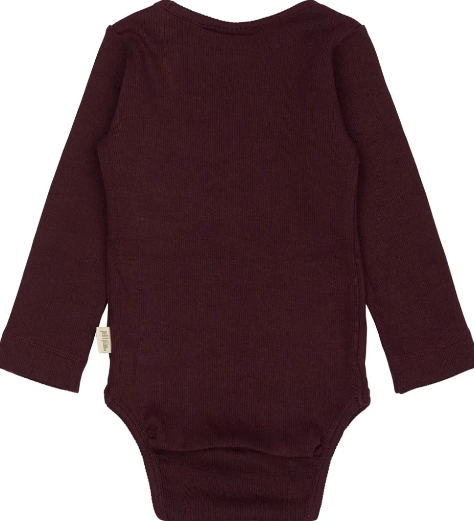 Elegant Petit Piao body med lange ærmer i en dyb bordeauxrød nuance. Den ribstrikkede struktur giver et klassisk udtryk, der skaber et tidløst design. Bodyen fra Petit Piao er forsynet med praktisk trykknaplukning i bunden, hvilket gør det nemt ved bleskift.