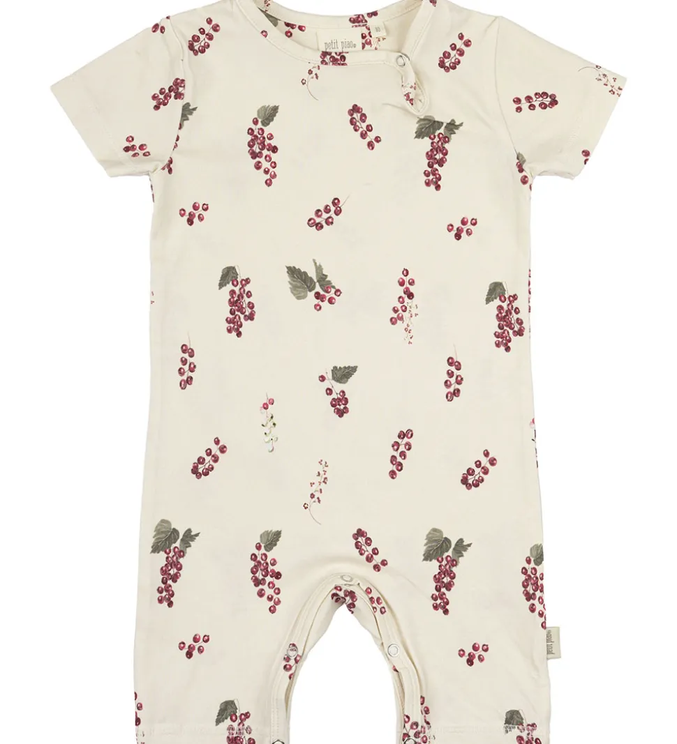 Skøn sommerdragt fra Petit Piao i en lys beige med et fint bærprint i røde og grønne nuancer. Sommerdragten har korte ærmer og knaplukning ved skulderen samt mellem benene til nem påklædning.
