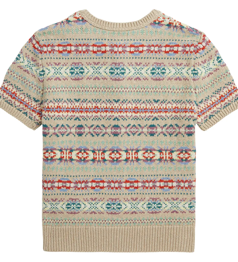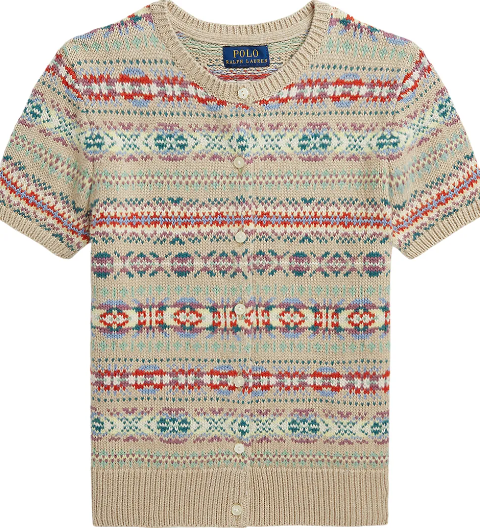 Flot Polo Ralph Lauren cardigan i meleret beige med et stribet mønster i rød, grøn, lyseblå, lysegul, lilla og hvid.