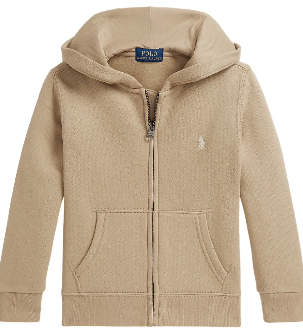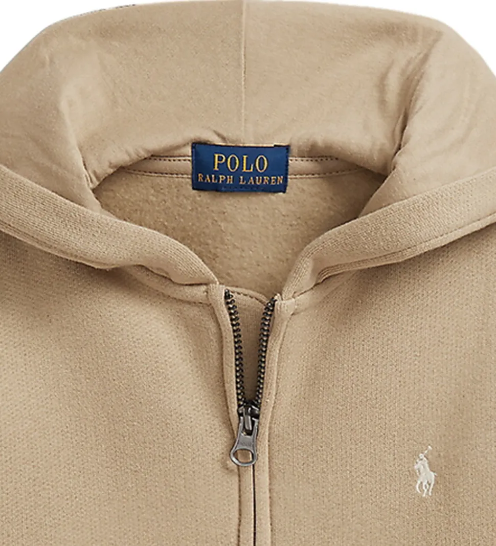 Flot Polo Ralph Lauren cardigan i beige sweat. Cardiganen har en enkel lynlåslukning foran og byder på en behagelig hætte, der giver ekstra beskyttelse. Polo Ralph Laurens ikoniske logo er elegant placeret på brystet, hvilket tilføjer et eksklusivt touch. Fortil er der praktiske lommer, og cardiganen har blødt, børstet bomuld på indersiden.