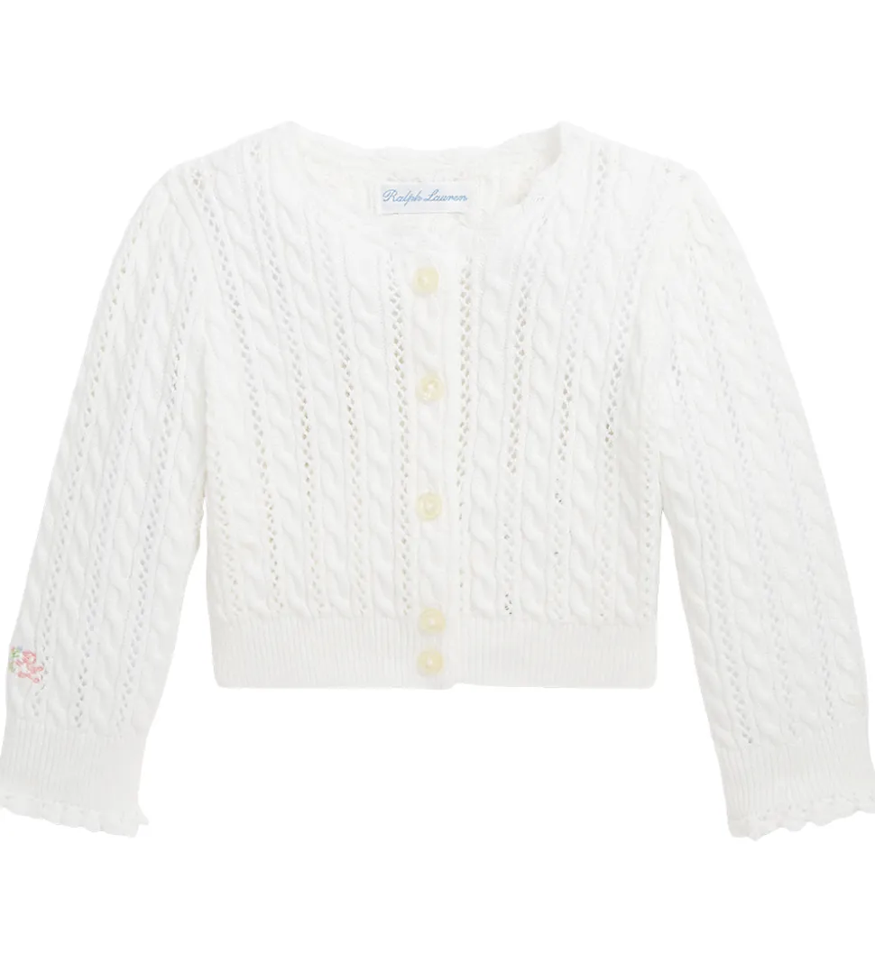 Sød Polo Ralph Lauren cardigan i ensfarvet hvid i en strikket kvalitet med et flot, snoet mønster samt et fint hulmønster.