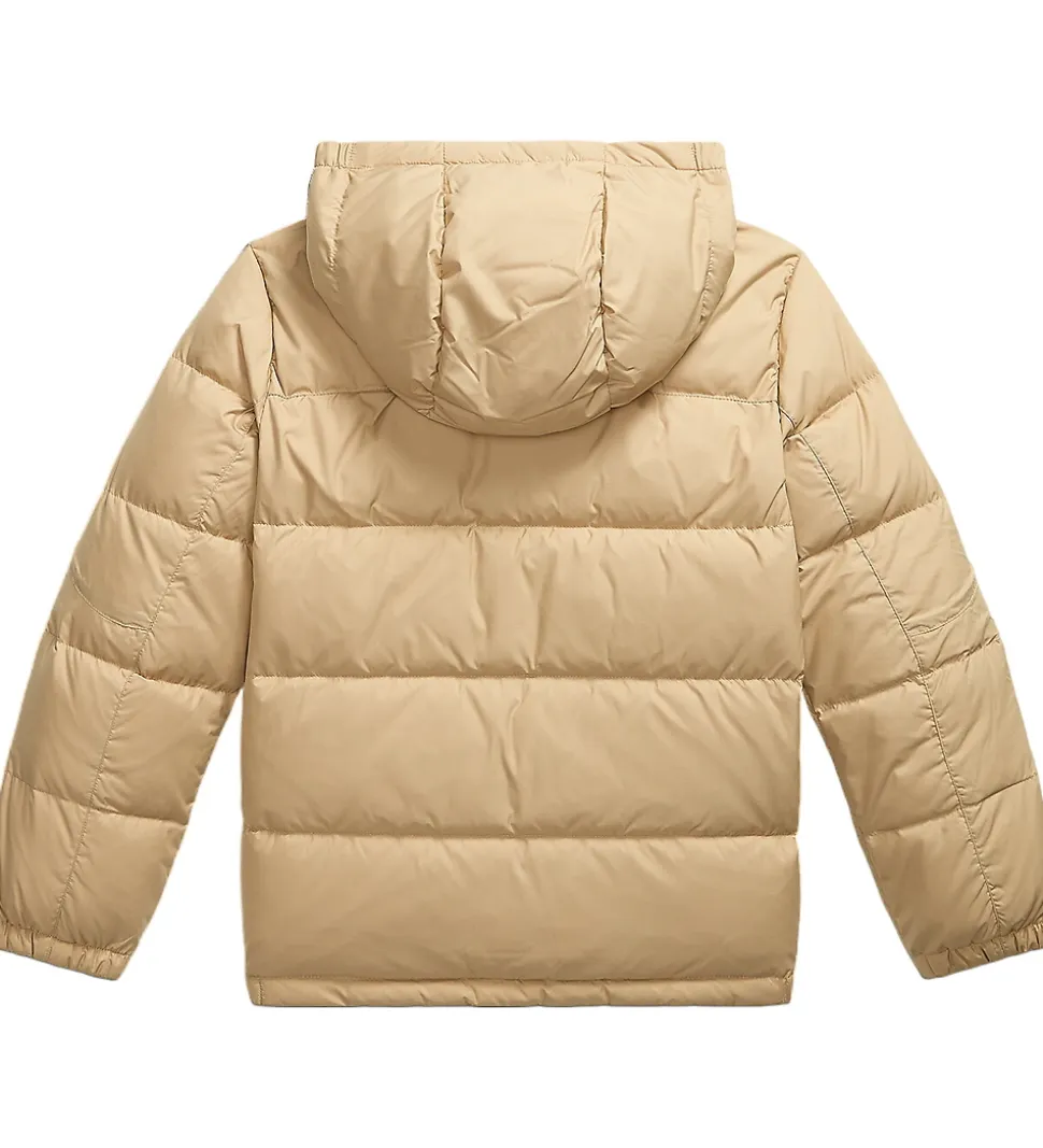 Skøn Polo Ralph Lauren dunjakke i ensfarvet beige med et lille, mørkegrønt logo broderet i venstre side.