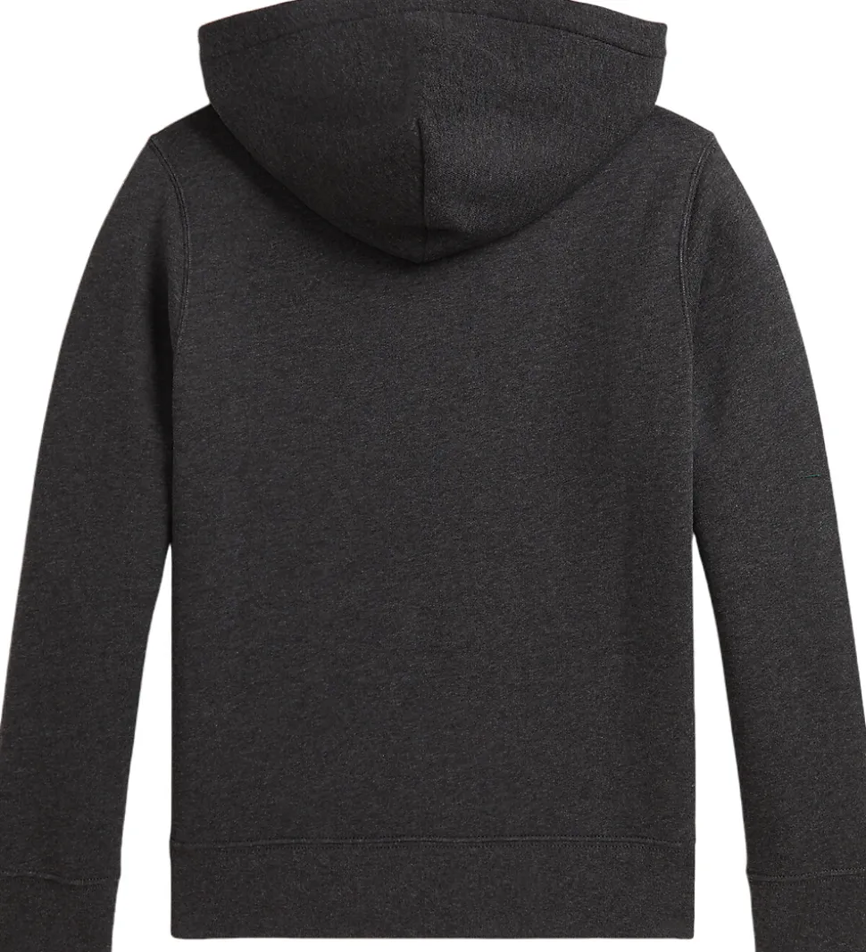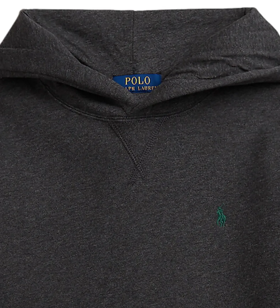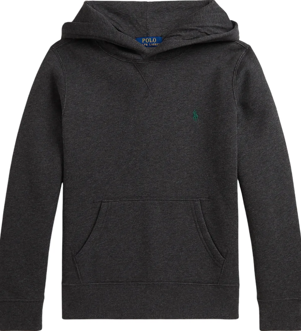 Lækker Polo Ralph Lauren hættetrøje i gråmeleret sweat, og fortil i venstre side er der broderet et lille, grønt logo. Hættetrøjen har en fasy hætte med et bomuldsfor, og fortil sidder der en stor kængurulomme. Hættetrøjen har blødt, børstet bomuld på indersiden.