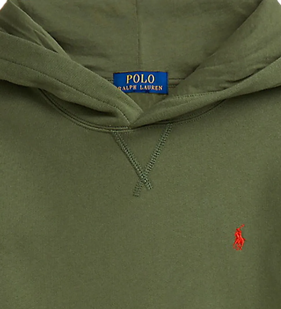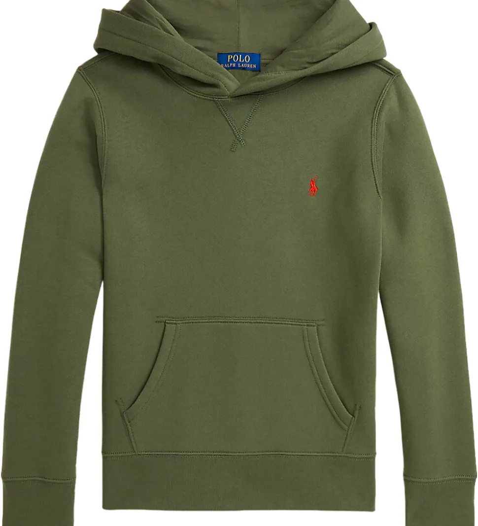 Praktisk Polo Ralph Lauren hættetrøje i olivengrønt sweat med det ikoniske logo broderet i rød på brystet. Hættetrøjen har en klassisk kængurulomme foran samt en smart hætte. Polo Ralph Lauren hættetrøjen er designet med ribkanter, og den har blødt, børstet bomuld på indersiden.