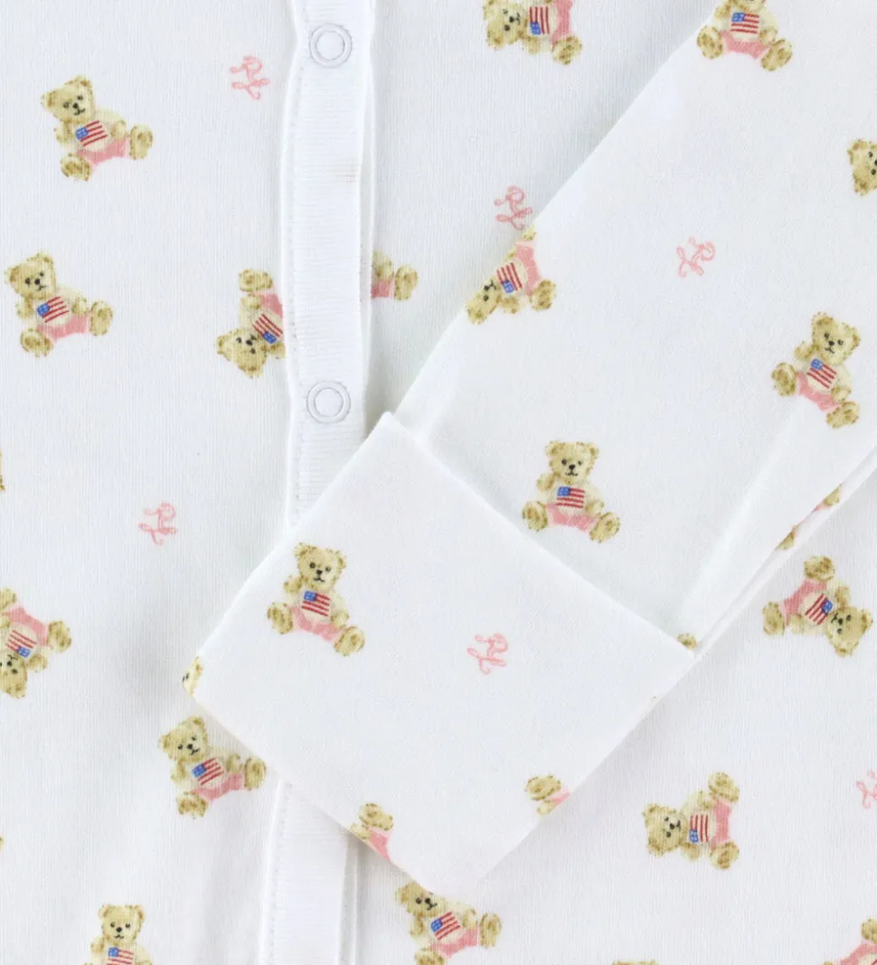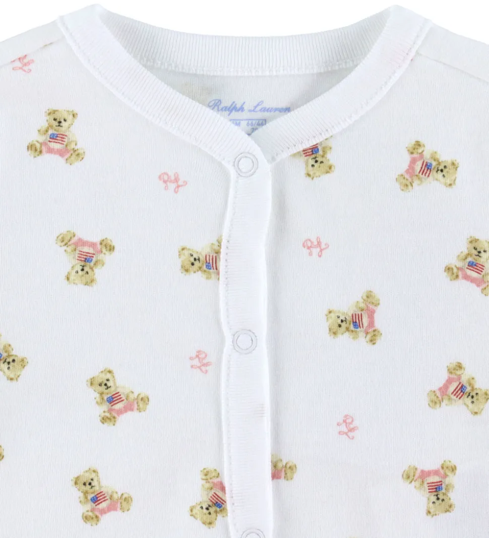 Sød Polo Ralph Lauren heldragt i hvid med et print med små brune bamser med et amerikansk flag på maven.
