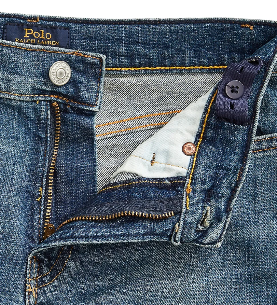Attraktive jeans fra Polo Ralph Lauren i blåt denim med en let slidt effekt og i en strækbar kvalitet. Polo Ralph Lauren jeansene har en justerbar elastikkant i livet, og de lukkes med en knap og en lynlås. Jeansene har forlommer og en møntlomme samt baglommer.