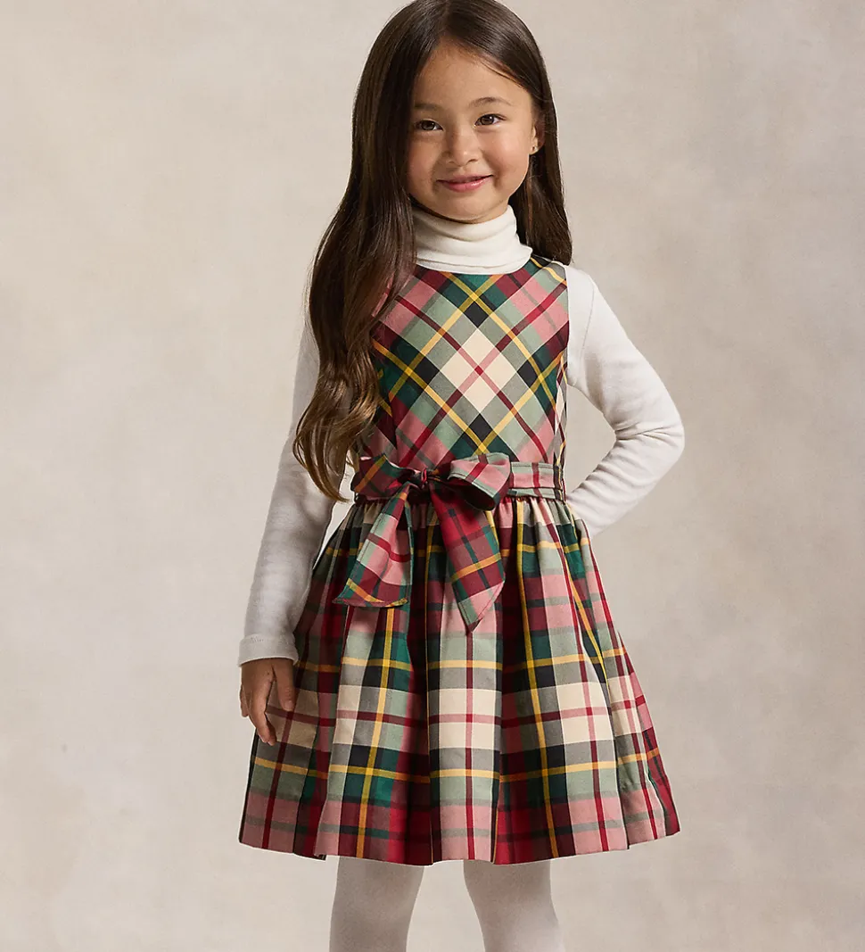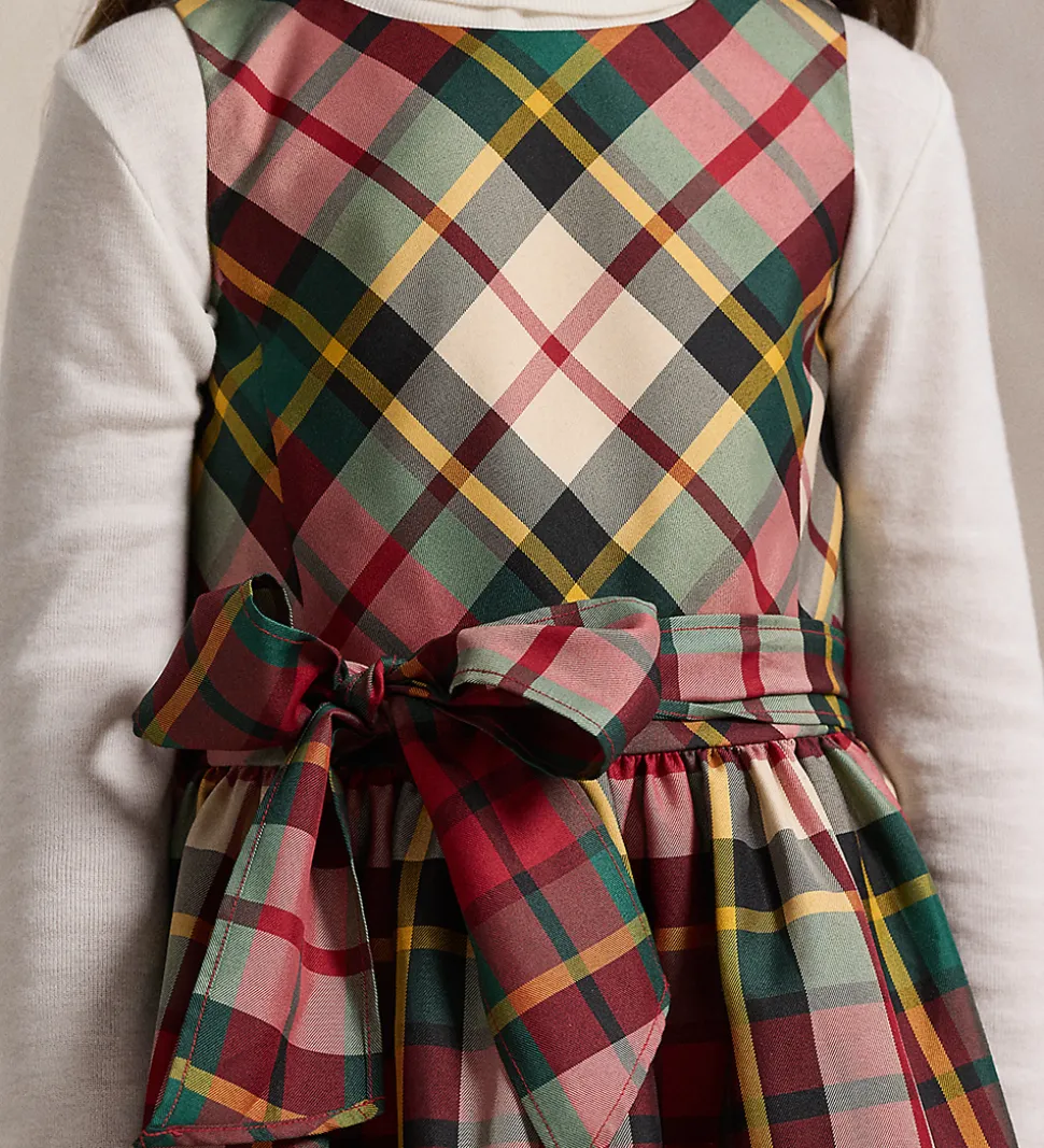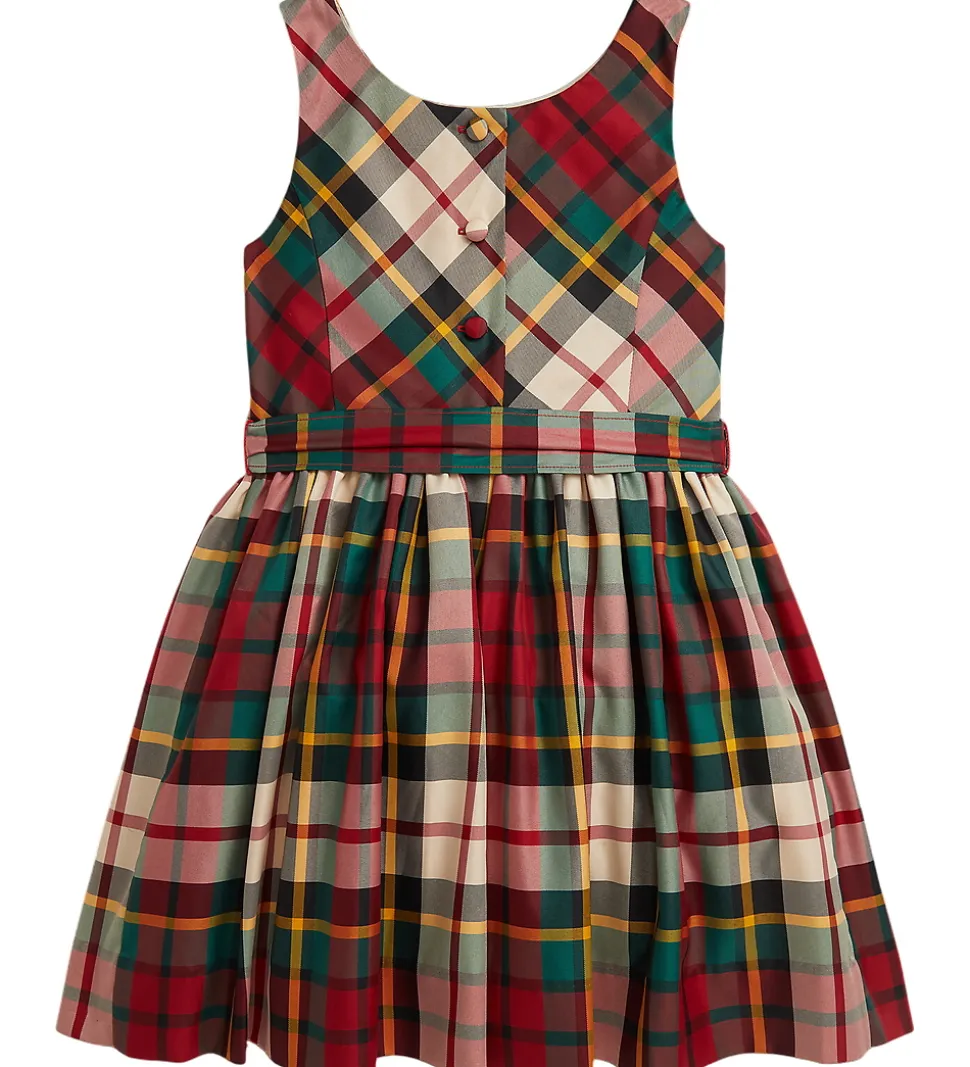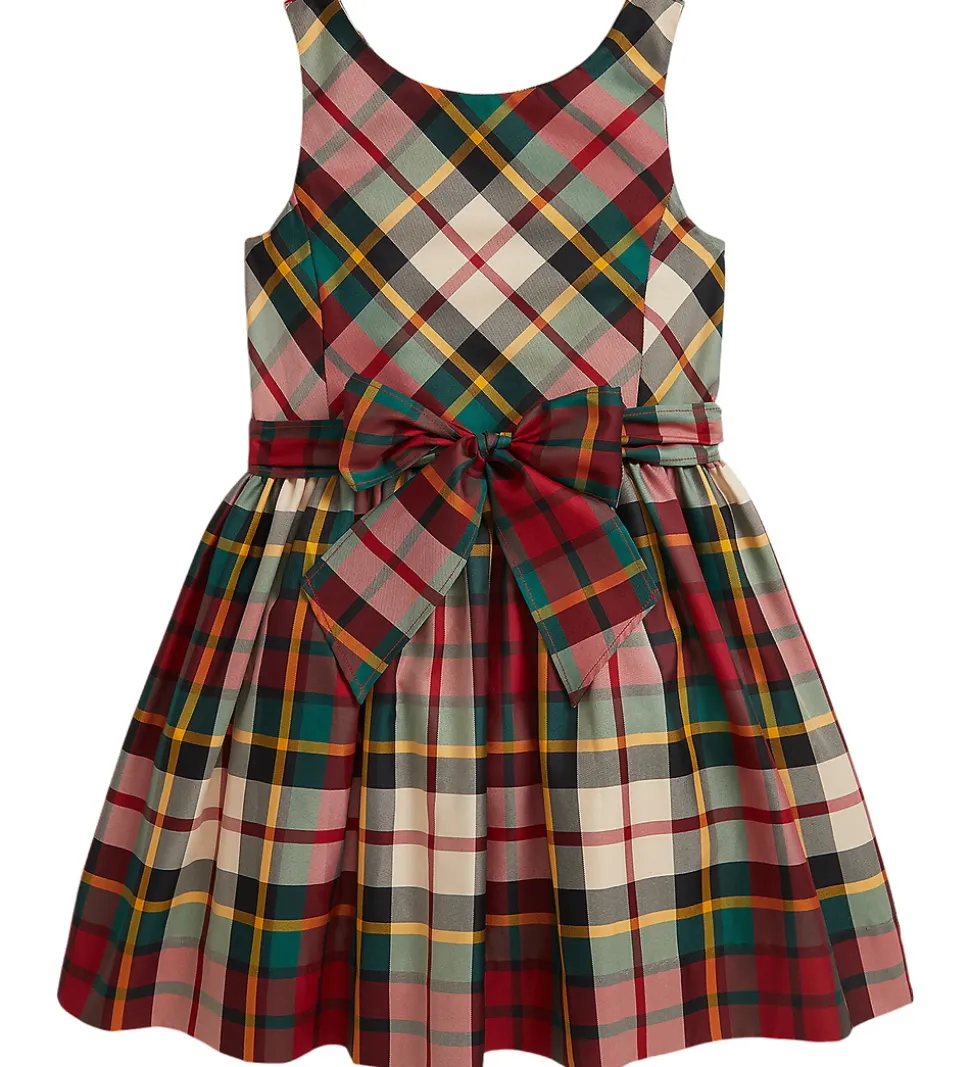 Elegant Polo Ralph Lauren kjole med et klassisk ternet mønster i røde, grønne, gule og cremefarvede nuancer. Kjolen er helt uden ærmer, og den har et flot skørt med masser af vidde. I livet er der et bredt bånd, som kan bindes i en fin sløjfe, og kjolen lukkes i ryggen med knapper. Kjolen består af to lag blødt satin, og det inderste lag er cremefarvet med tyl i bunden, så skørtet bliver ekstra fyldigt.
