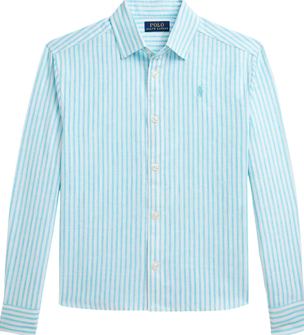 Polo Ralph Lauren skjorten har lange ærmer med brede kanter og to manchetknapper, og i halsåbningen har den en klassisk krave. Skjorten åbnes med små hvide knapper. Skjorten er lavet i en let, fastvævet hørblanding.