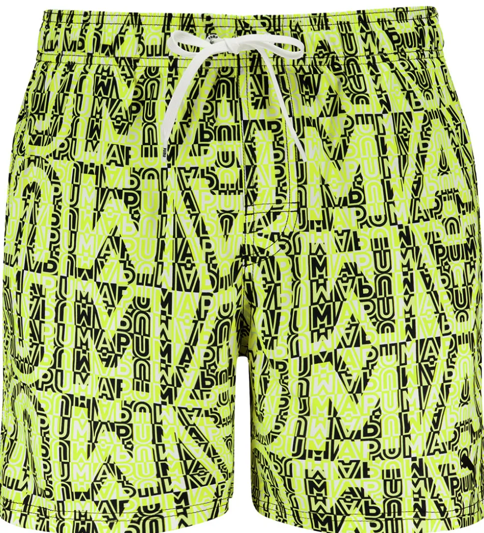 Stilfulde Puma badeshorts med et vibrerende design i limegrøn og sort, hvor “Puma” er gentaget over hele stoffet i et moderne, grafisk mønster.