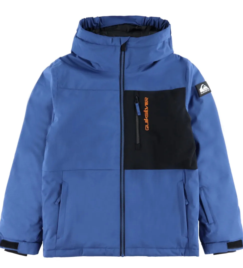 Sej Quiksilver vinterjakke i støvet mørkeblå med en sort indsats på venstre bryst samt et orange logo. Vinterjakken har også en lille gummi-logoapplikation på venstre overarm.