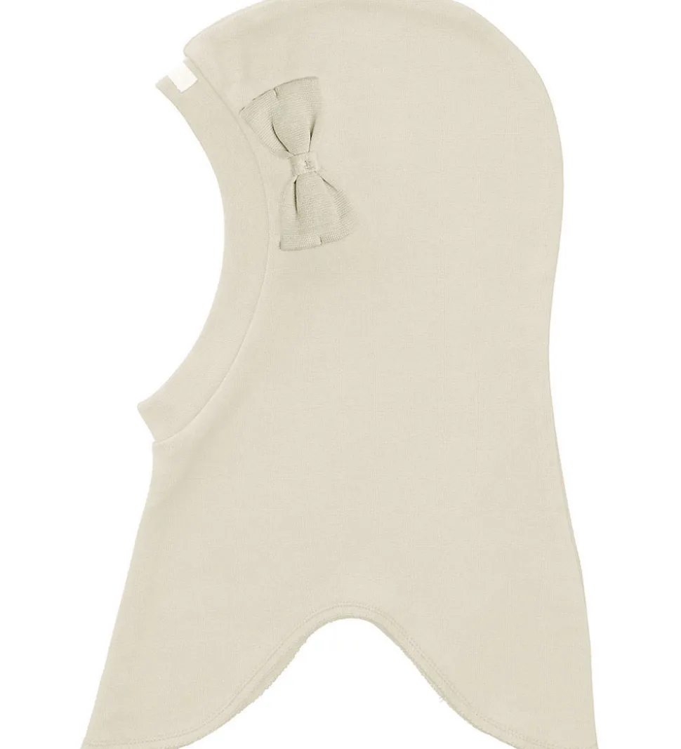Flot Racing Kids elefanthue i cremehvid med en fin sløjfe på venstre side.