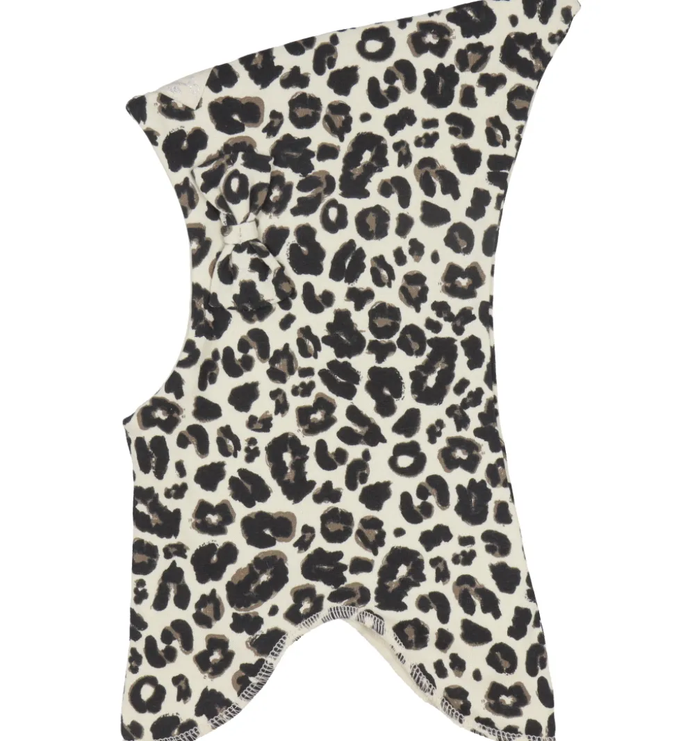Flot Racing Kids elefanthue i cremehvid med sort og brunt leopardprint og en fin sløjfe på venstre side.