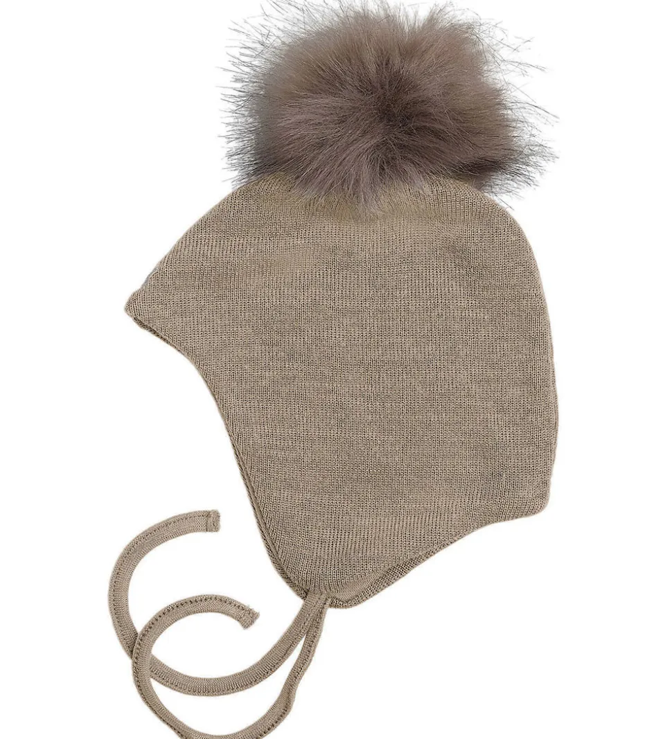 Lækker Racing Kids hue i lyesbrun i en strikket kvalitet med en imiteret pelskvast i toppen.