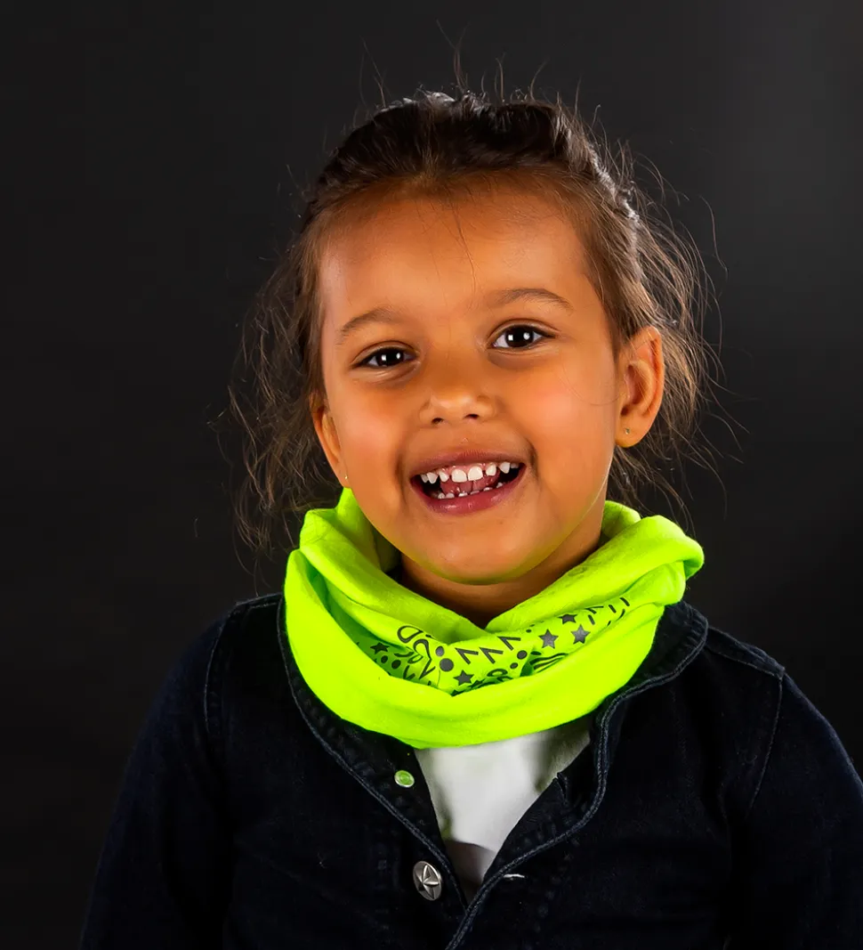 Reer tørklædet er formet som en tube, så den nemt kan placeres på barnet. Tørklædet er med smarte reflekser, så barnet nemt kan blive set i de mørke timer.