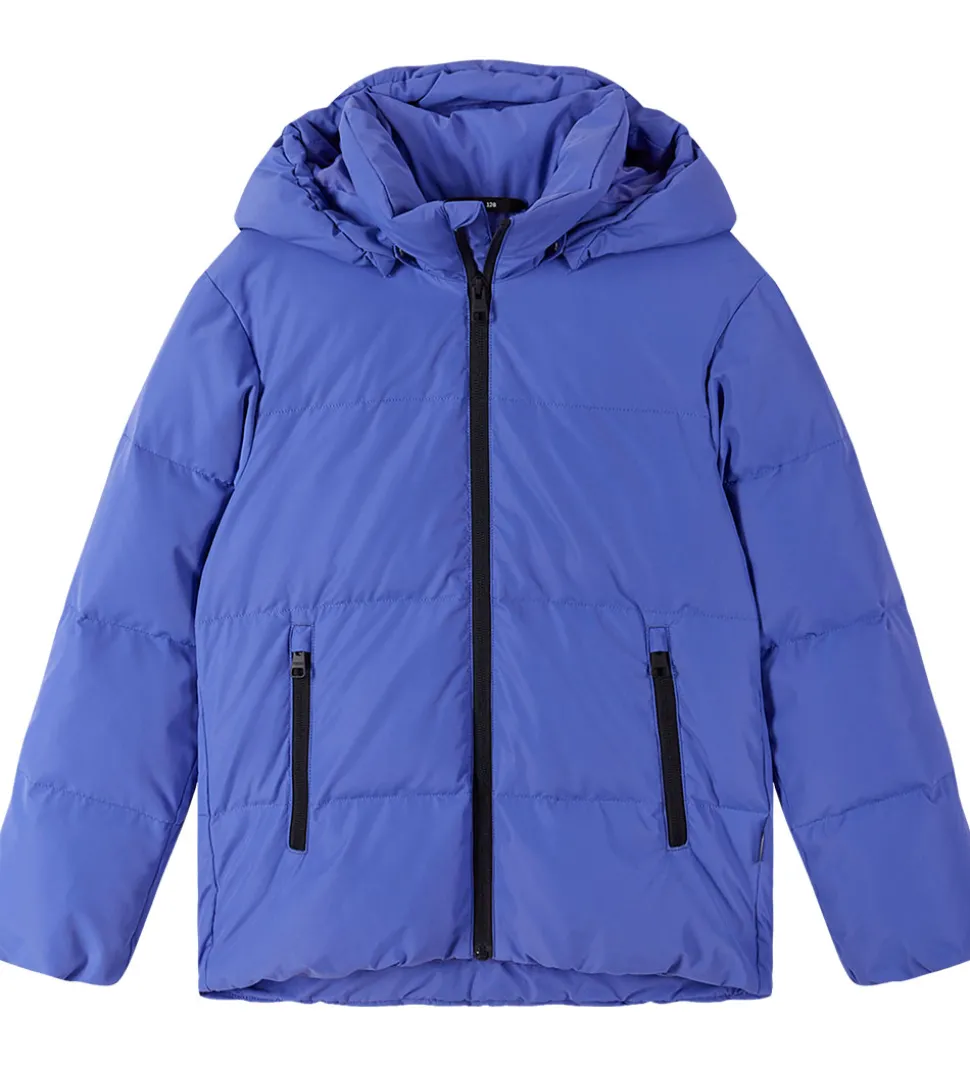 Reima dunjakken har en aftagelig hætte, som fæstnes langs den høje halskrave med skjulte trykknapper. Ærmerne har indvendige elastikanter.