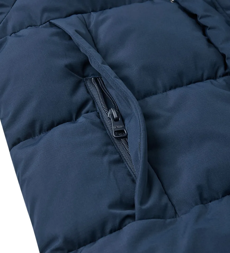 Flot Reima dynejakke i ensartet navy med vandrette syninger.