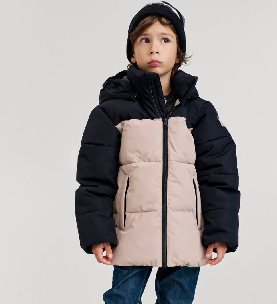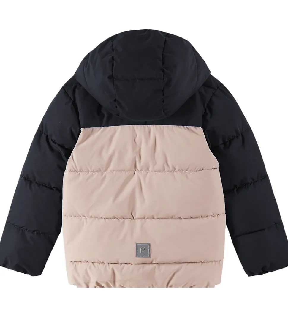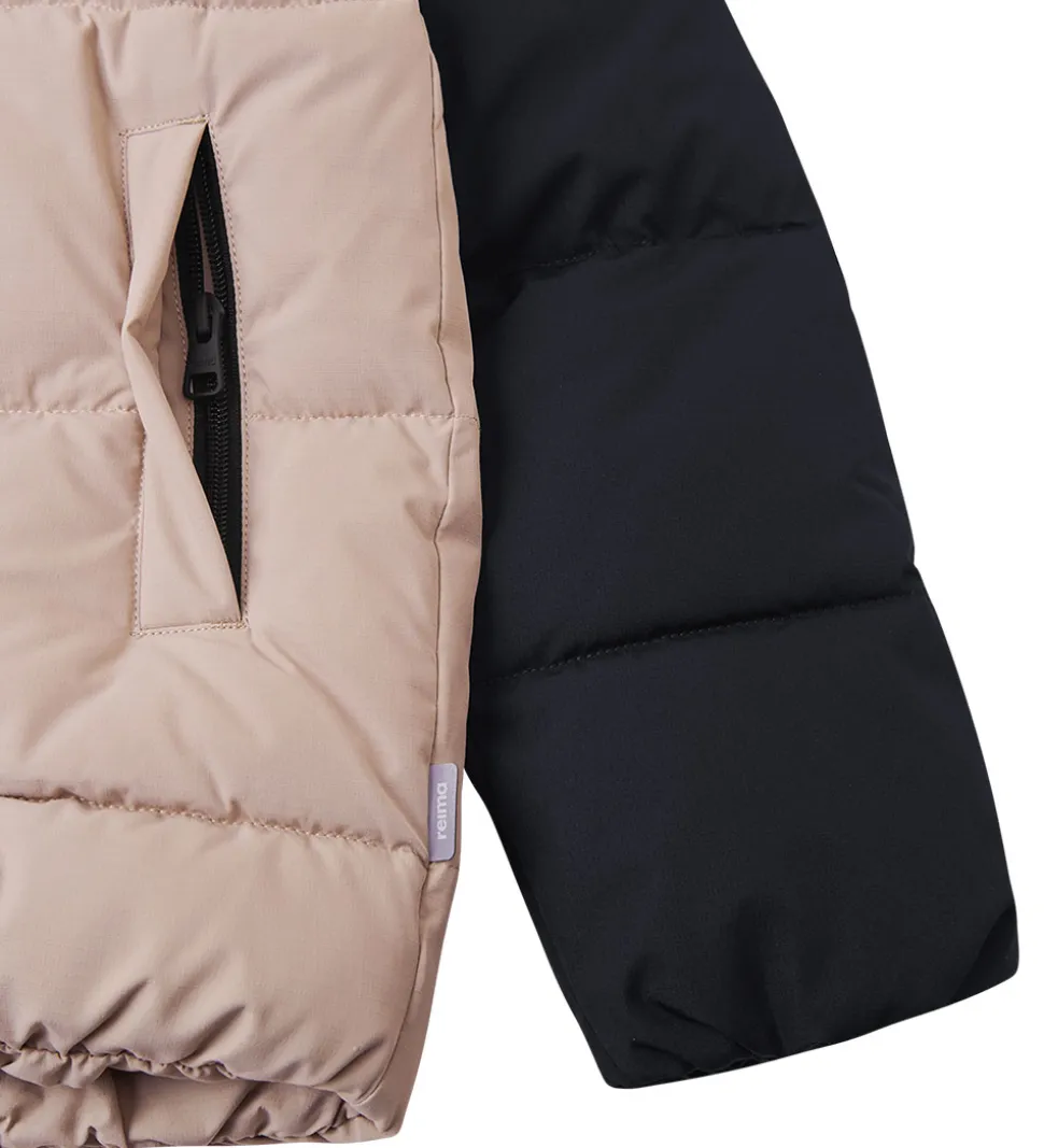 Flot Reima dynejakke i beige og sort med vandrette syninger.