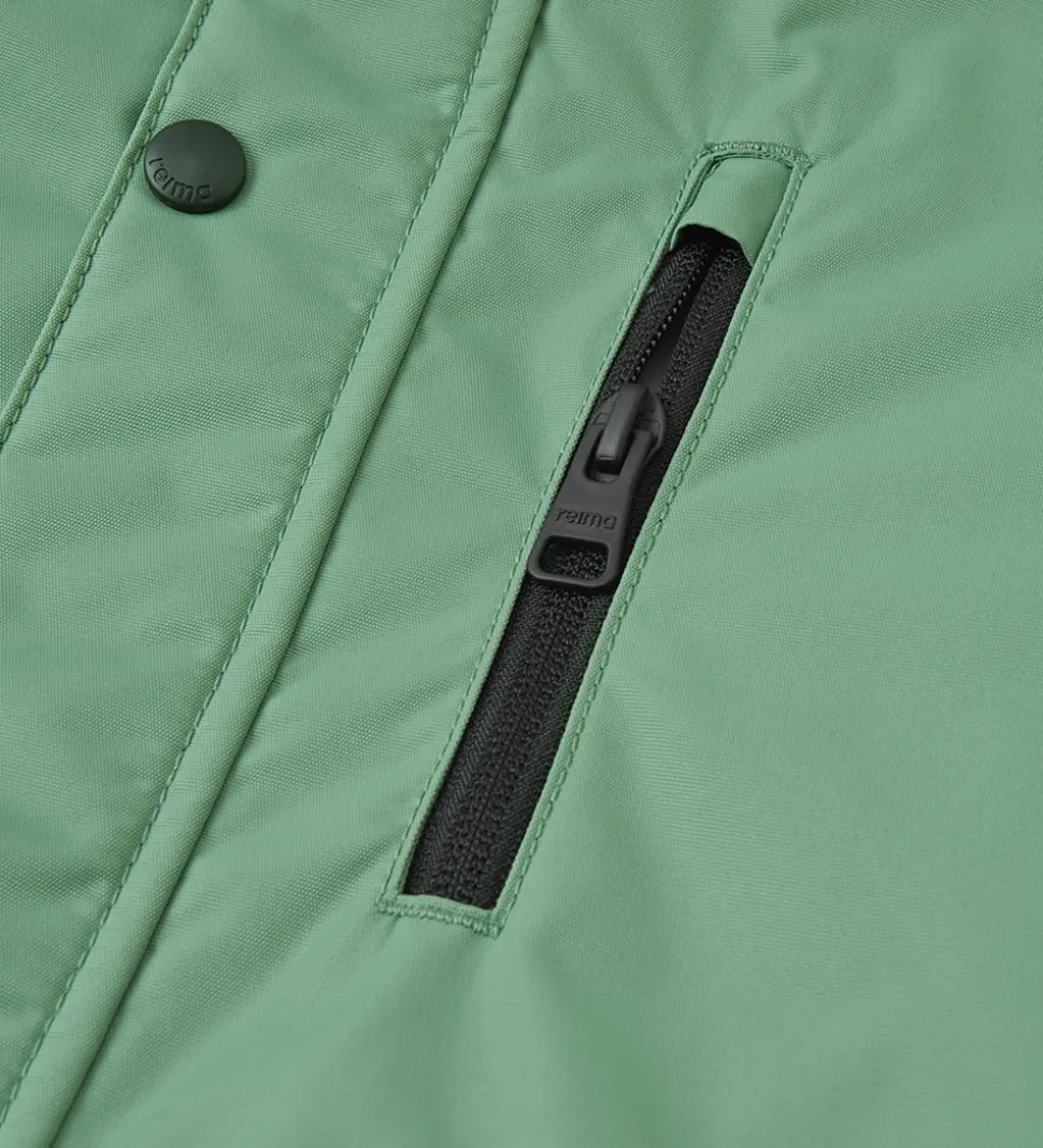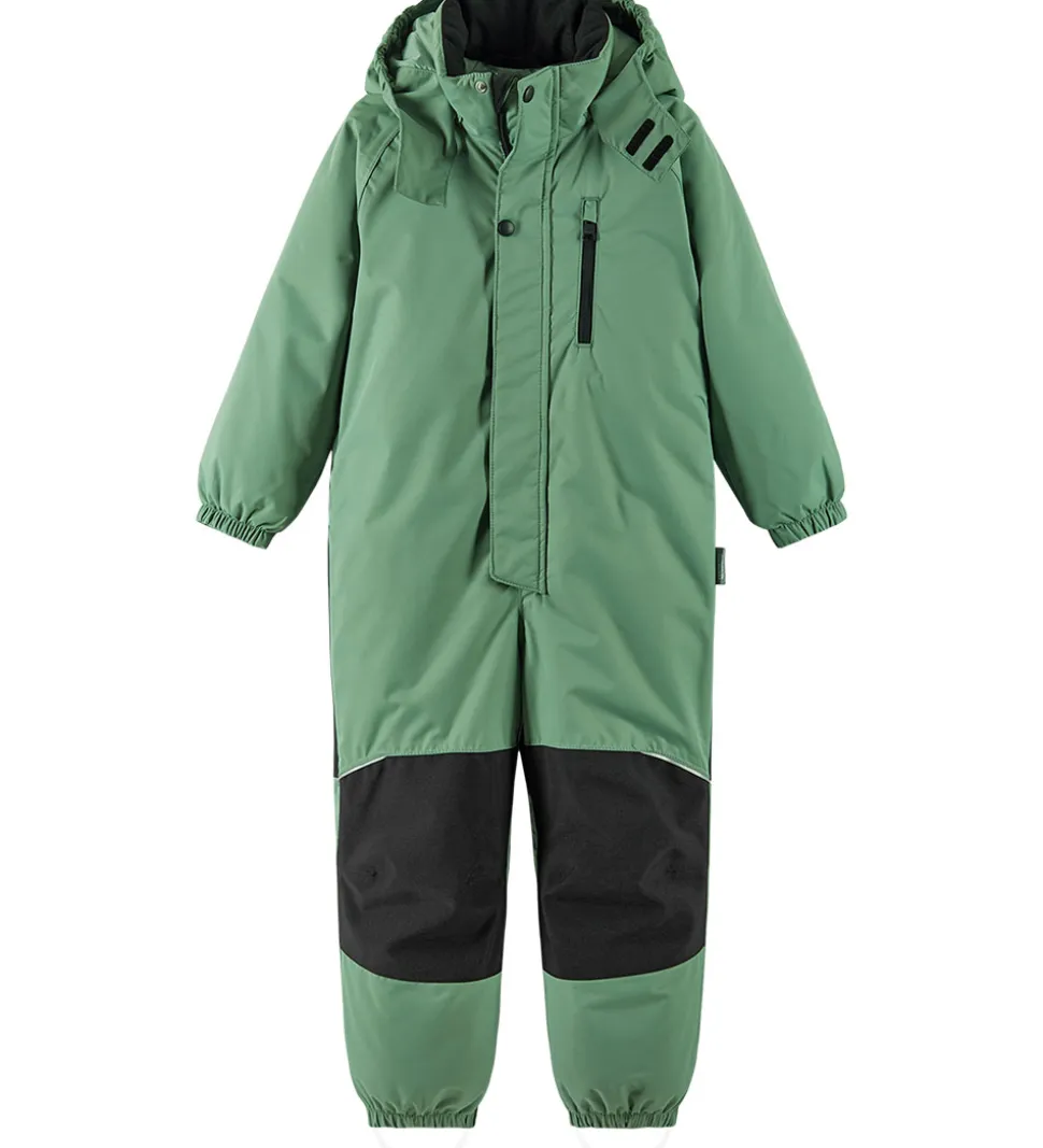 Fin Reima flyverdragt i grøn med sorte forstærkninger på knæ og siddeområde.