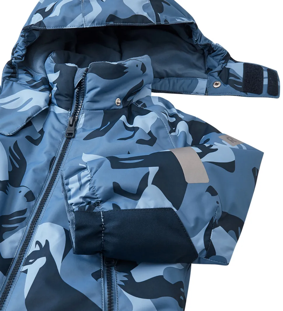 Skøn Reima flyverdragt i blå nuancer og med dyreprint.