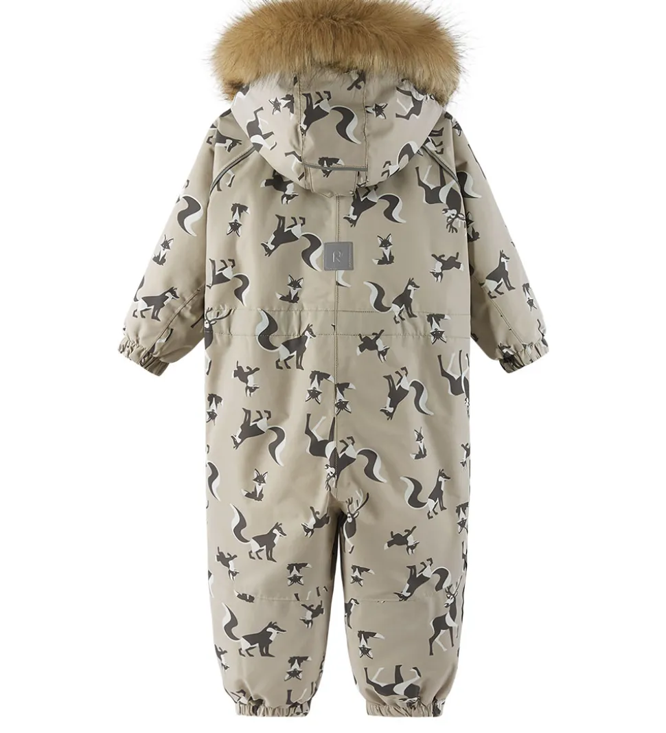 Smuk Reima flyverdragt i beige med et mørkt alloverprint af polardyr. Hætten har en flot kant af imiteret pels.