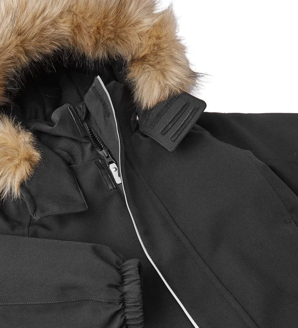 Fin Reima flyverdragt i ensfarvet sort, og hætten har en flot kant af imiteret pels.