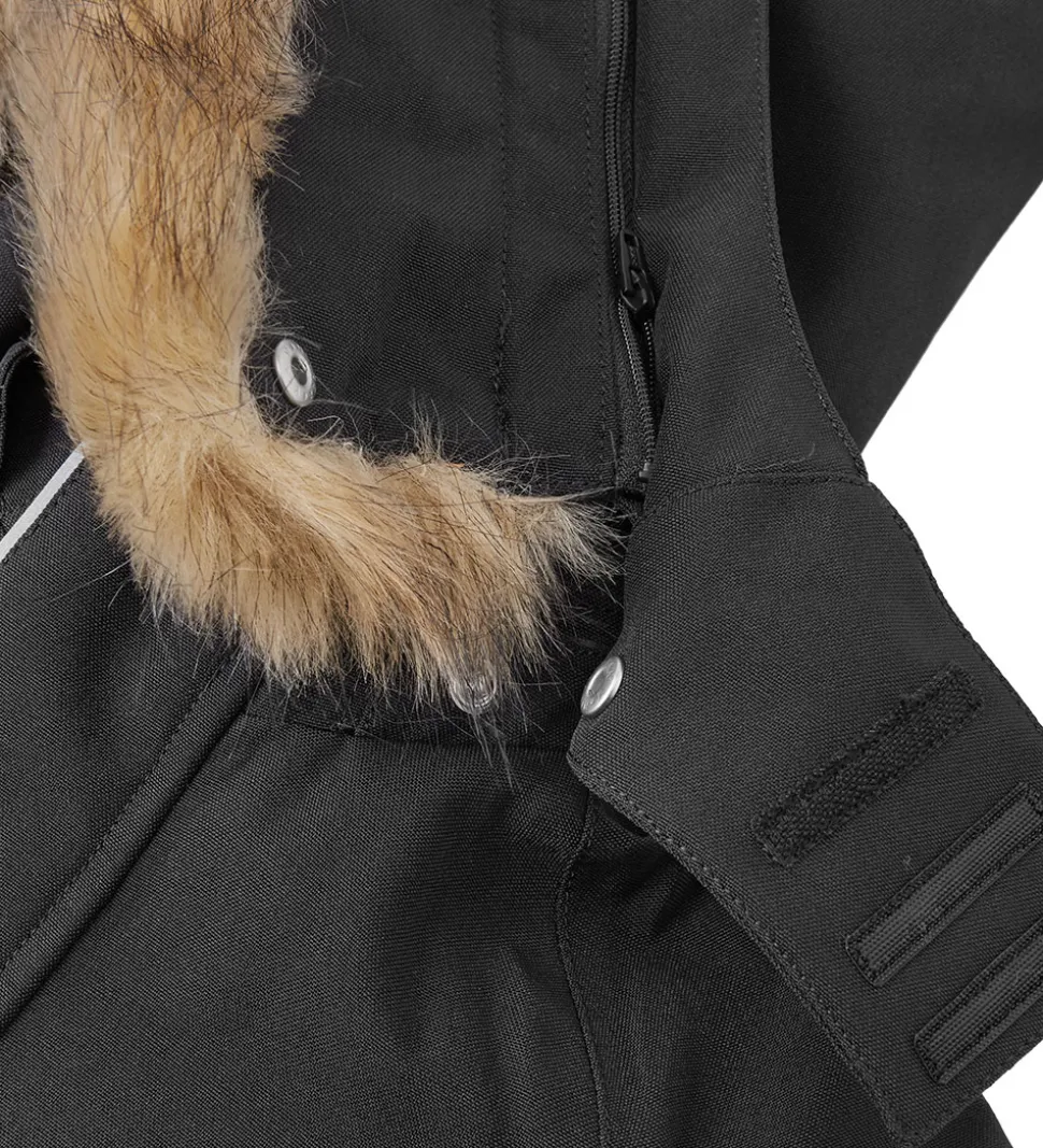 Reima flyverdragten har en aftagelig hætte, som sidder fast med skjulte trykknapper, og pelskanten sidder fast med en lynlås. Hætten lukkes foran hagen med velcro, og den kan justeres i toppen med en velcrorem.