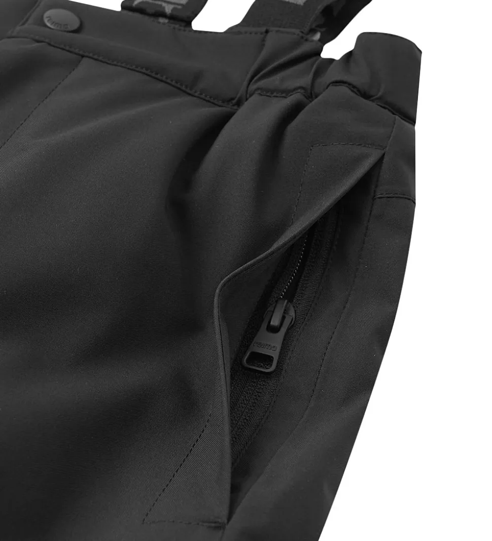Reima skibukserne har justerbare, aftagelige seler, som fæstnes med velcro, og de samles på ryggen, så de sidder godt fast på skuldrene. I livet er der en bred elastik, og skibukserne åbnes fortil med en tryknap og en lynlås. I siderne er der praktiske lommer, som lukkes med en skjult lynlås.