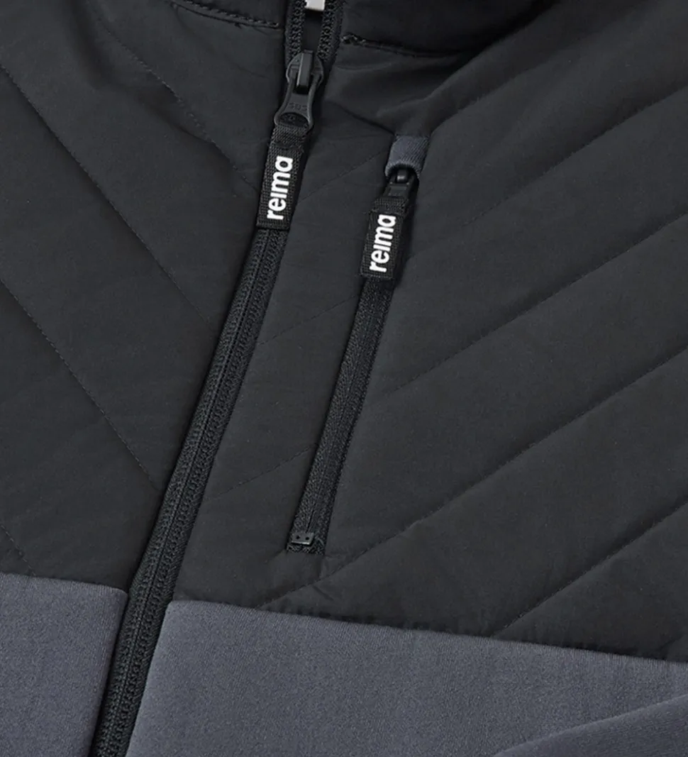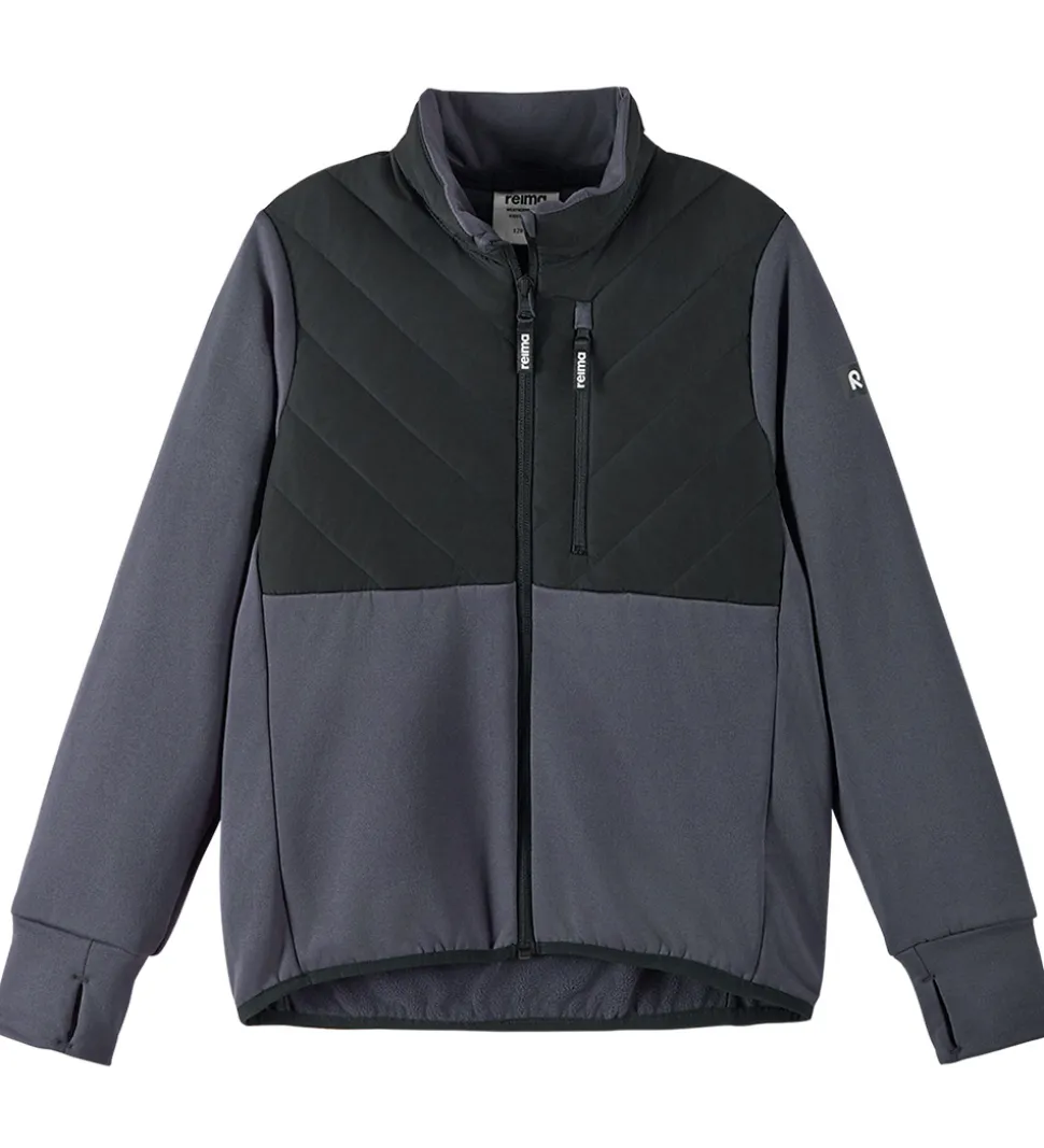 Lækker Reima softshelljakke i mørk koksgrå og med en øvre del, der er sort og med isolerende paneler, som på en termojakke.