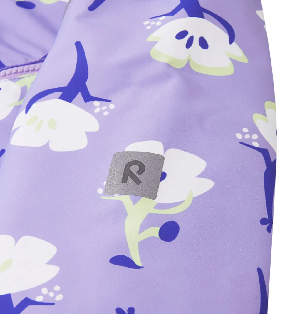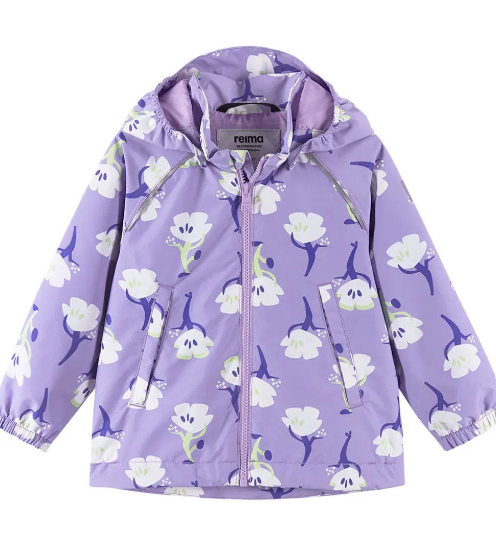 Lækker Reima sommerjakke i lilla med blomsterprint i hvid, mørkeblå og grøn.