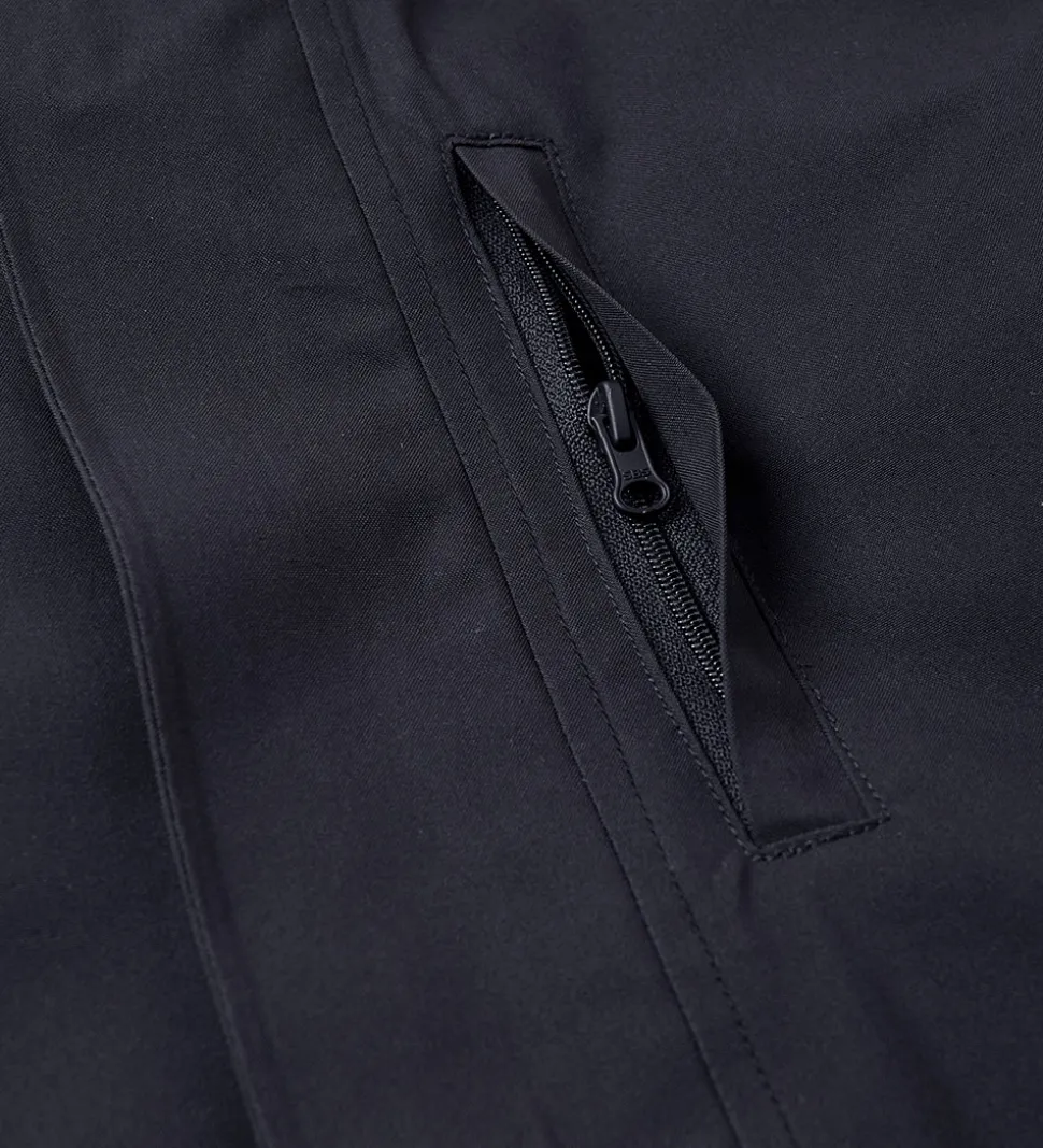 Vinterjakken åbnes med en lynlås med dobbelt vindstolpe, som lukkes på ydersiden med velcro. Fortil er der to markante klaplommer, som lukkes med velcro, samt en brystlomme med lynlås. Livåbningen har en smule high/low-effekt med en slids bagtil.