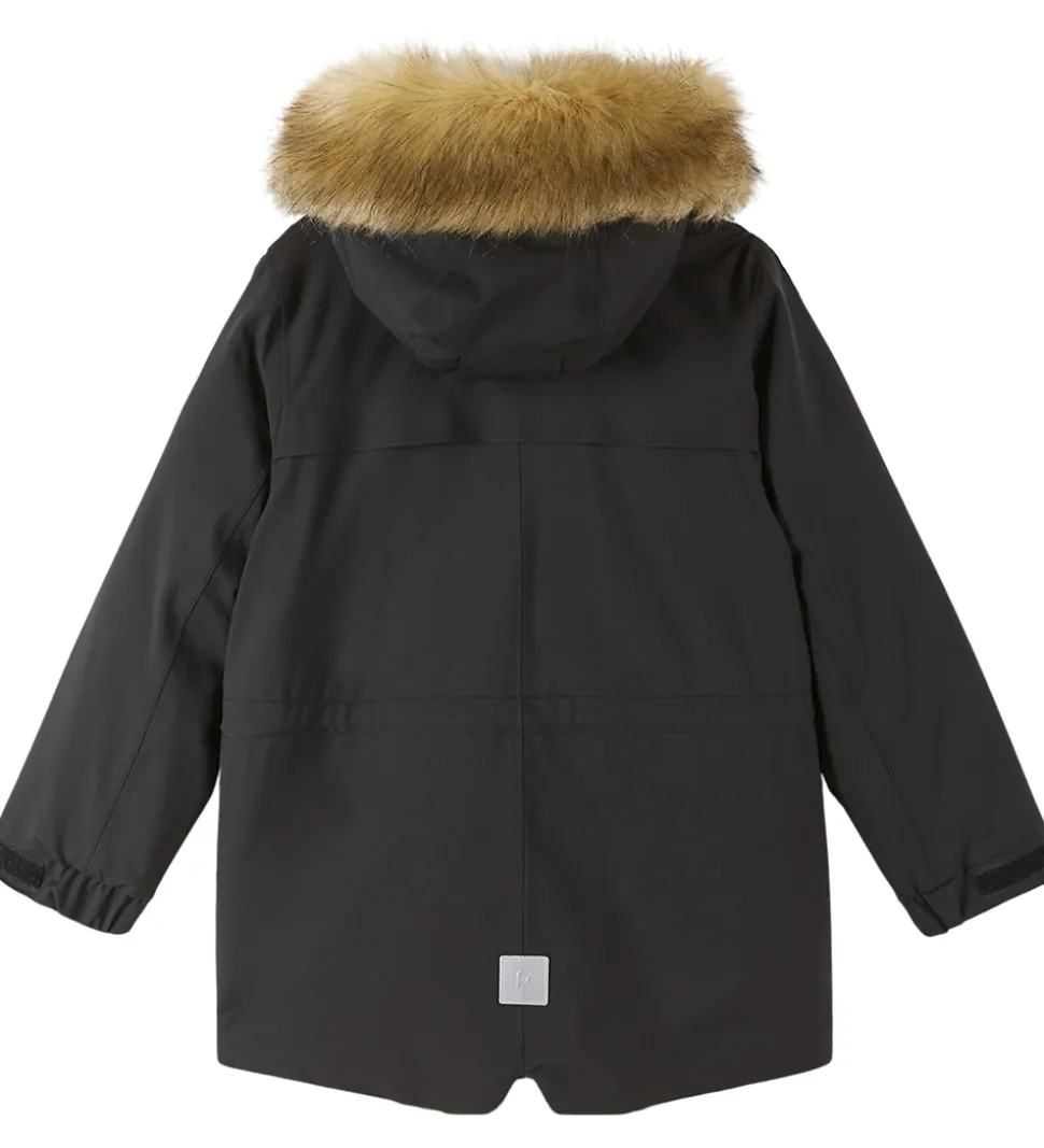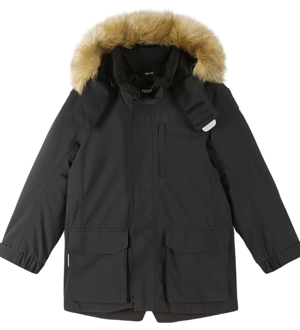 Fin Reima vinterjakke i ensfarvet sort, og hætten har en flot kant af imiteret pels.