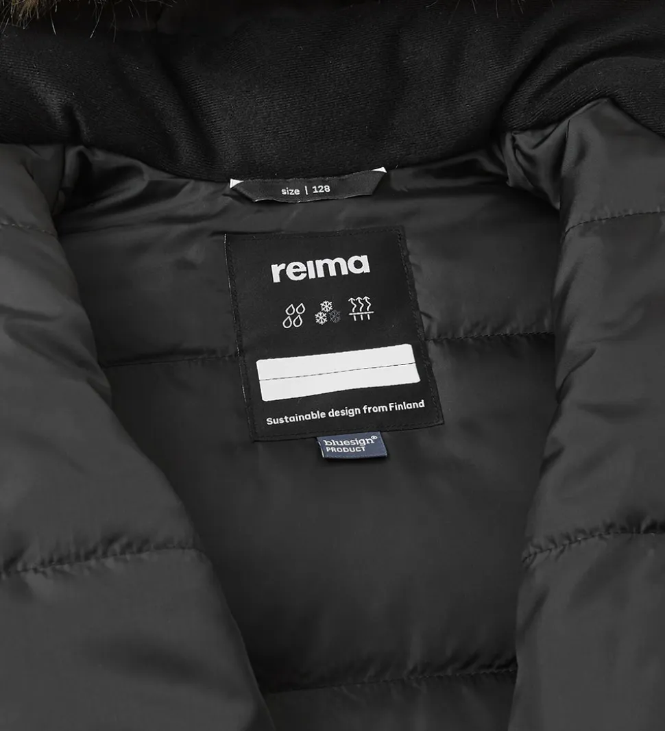 Reima vinterjakken har en aftagelig hætte, som sidder fast med skjulte trykknapper omkring den høje, fleeceforede halskrave, og pelskanten sidder fast med en lynlås. Hætten lukkes foran hagen med velcro, og den kan justeres i toppen med en velcrorem.