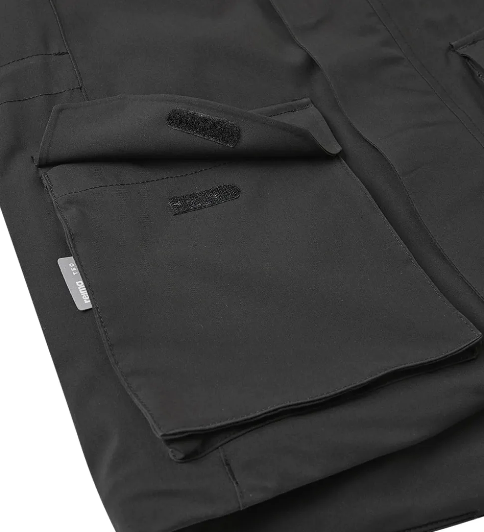 Vinterjakken åbnes med en lynlås med dobbelt vindstolpe, som lukkes på ydersiden med velcro. Fortil er der to markante klaplommer, som lukkes med velcro, samt en brystlomme med lynlås. Livåbningen har en smule high/low-effekt med en slids bagtil.