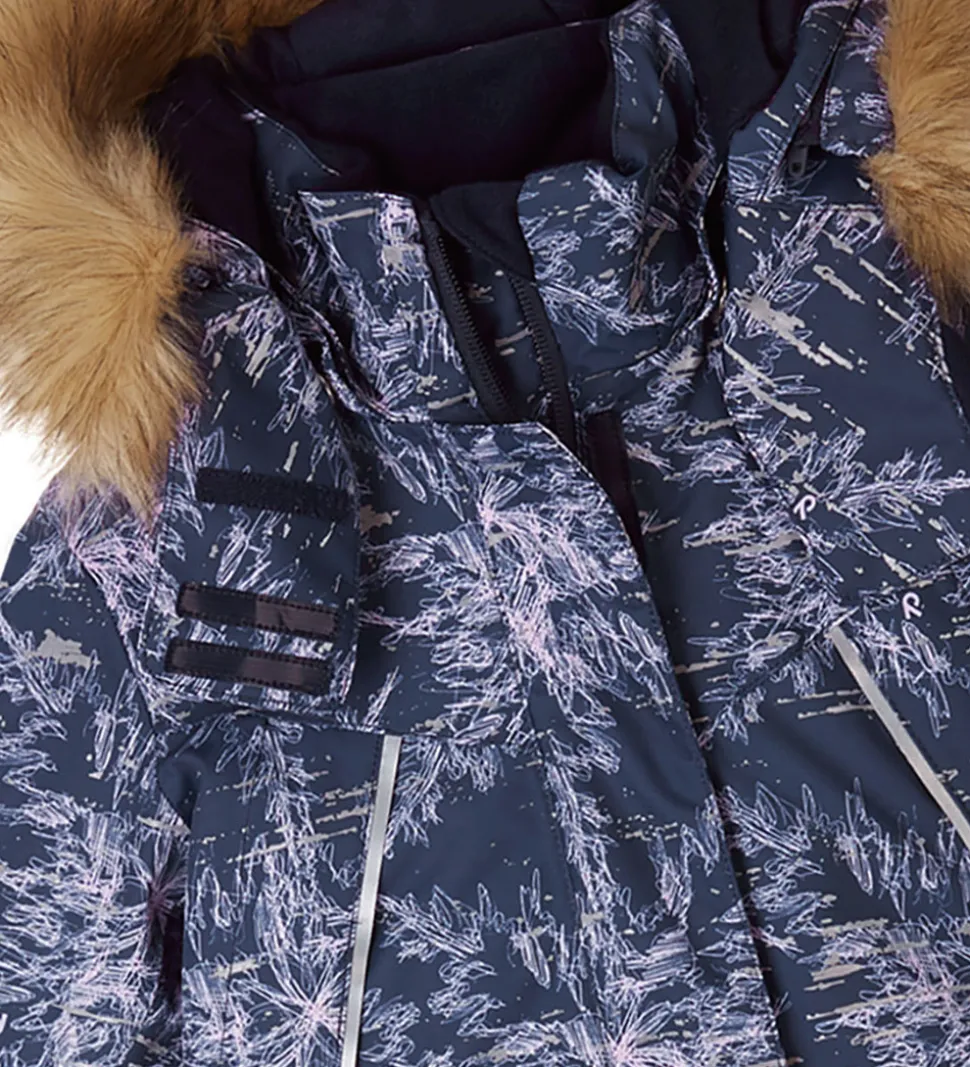 Flot Reima vinterjakke i blålilla med reflekterende allovermønster.