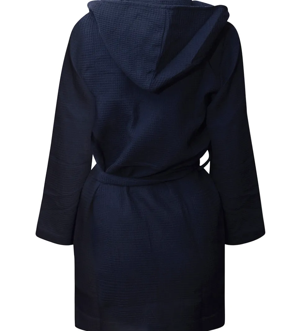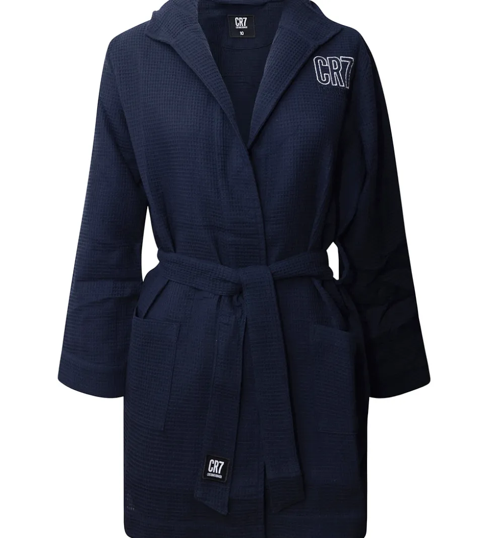 Lækker Ronaldo badekåbe i ensfarvet navy bomuld med vaffelstruktur, og fortil i venstre side er står der “CR7” broderet i sølv.