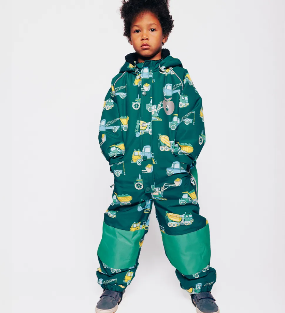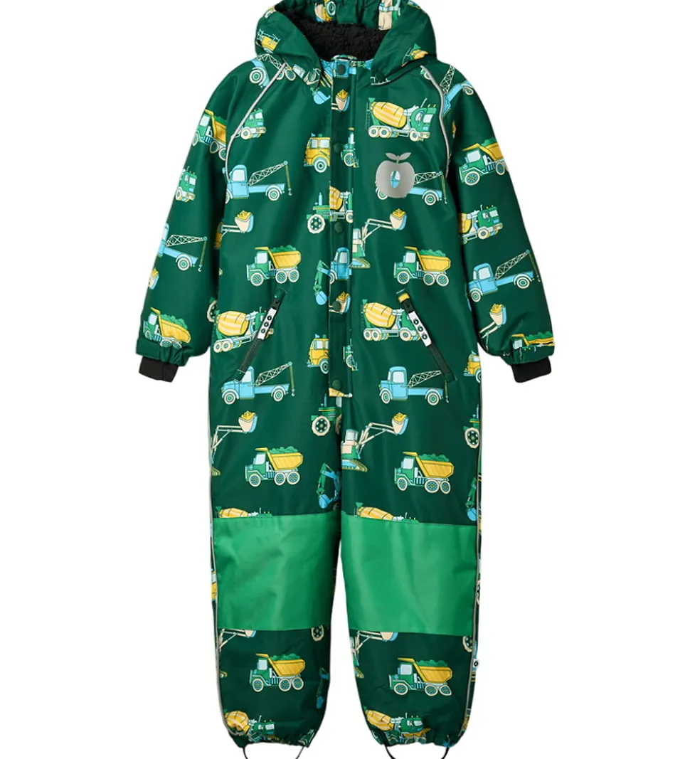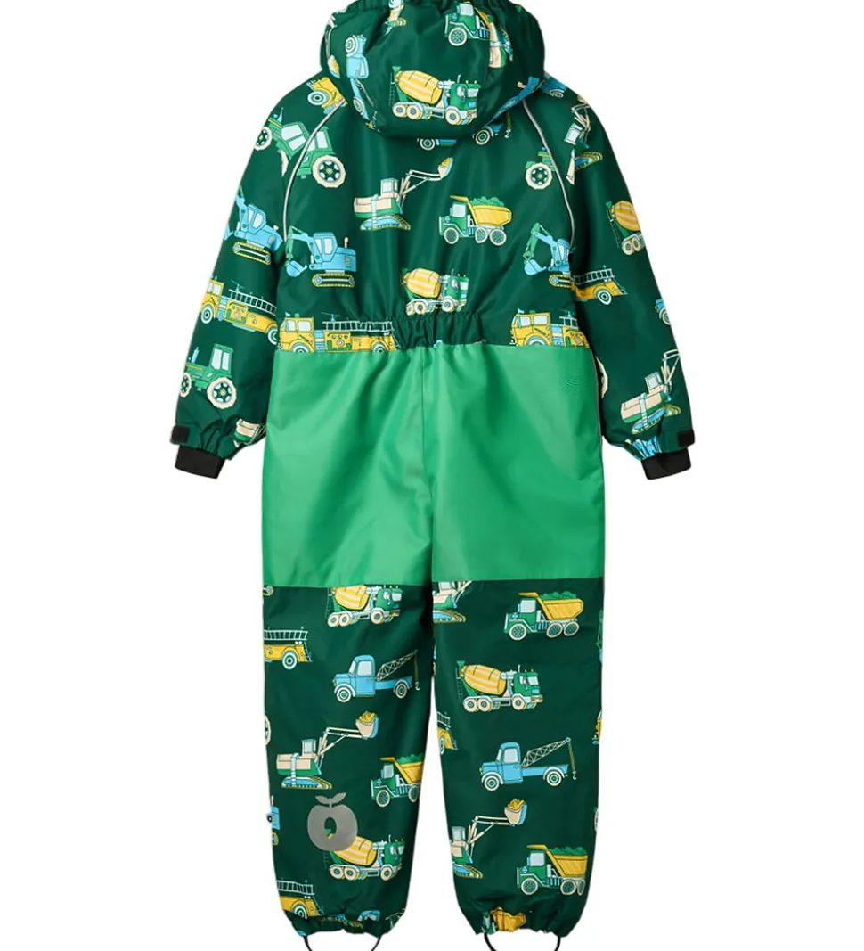 Skøn Småfolk flyverdragt i mørkegrøn med et alloverprint af farverige arbejdsbiler. Flyverdragten har lysegrønne forstrækninger og praktiske refleksdetaljer.