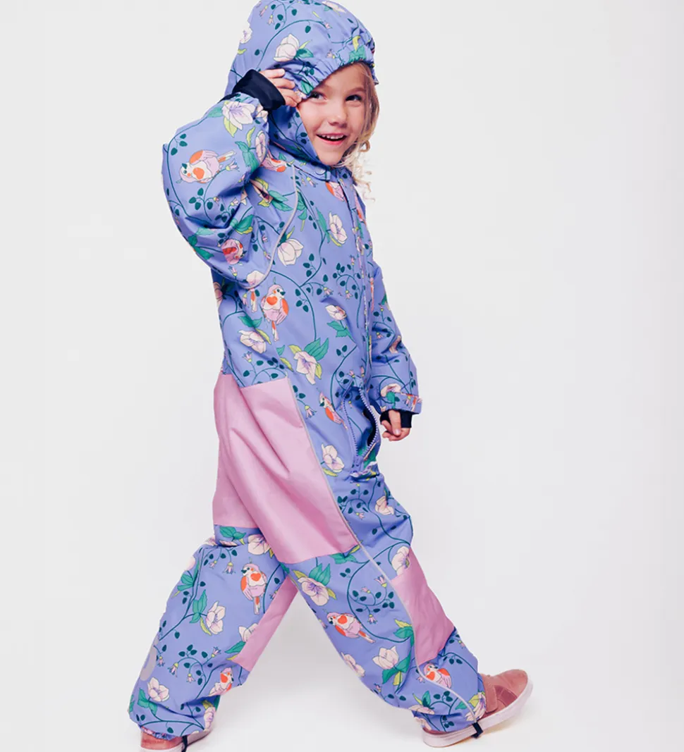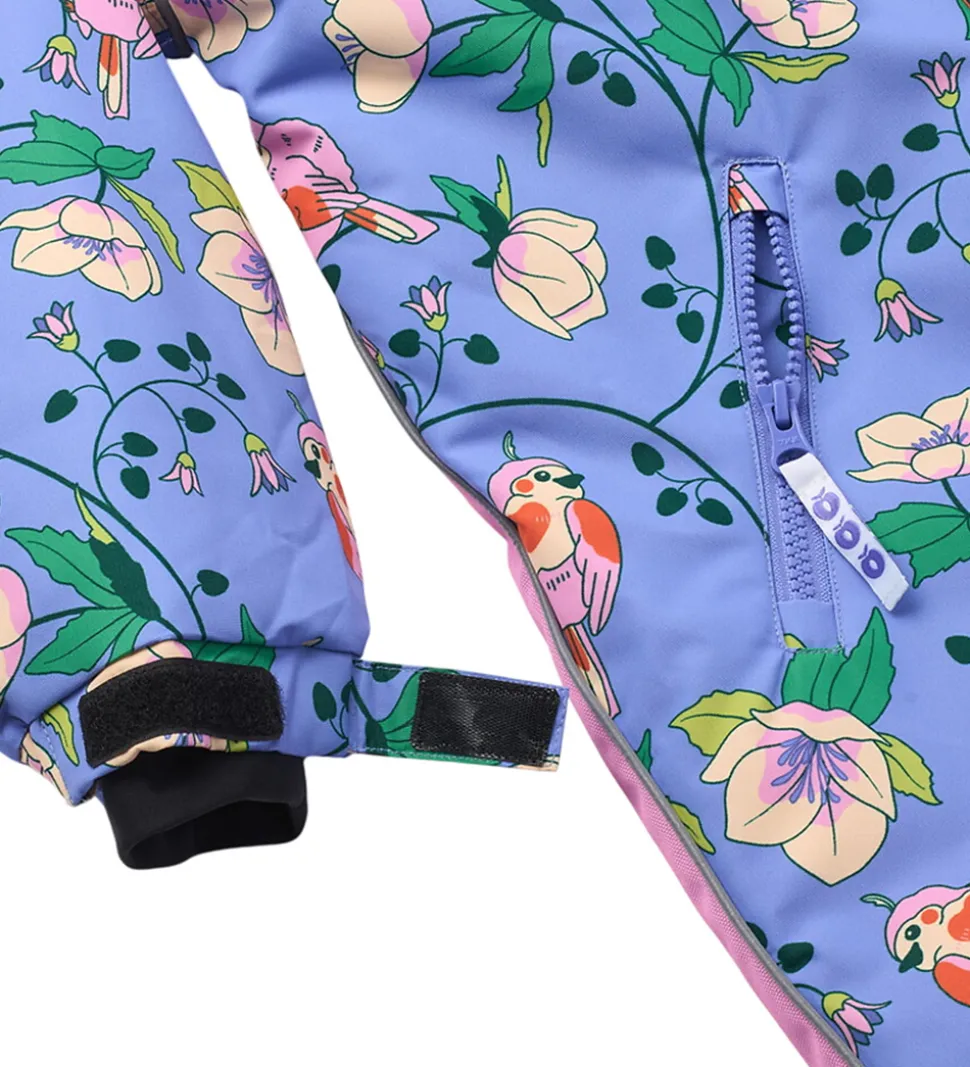Skøn Småfolk flyverdragt i en smuk lilla nuance med et charmerende blomsterprint og farverige fugle. Flyverdragten har rosa forstrækninger og praktiske refleksdetaljer.