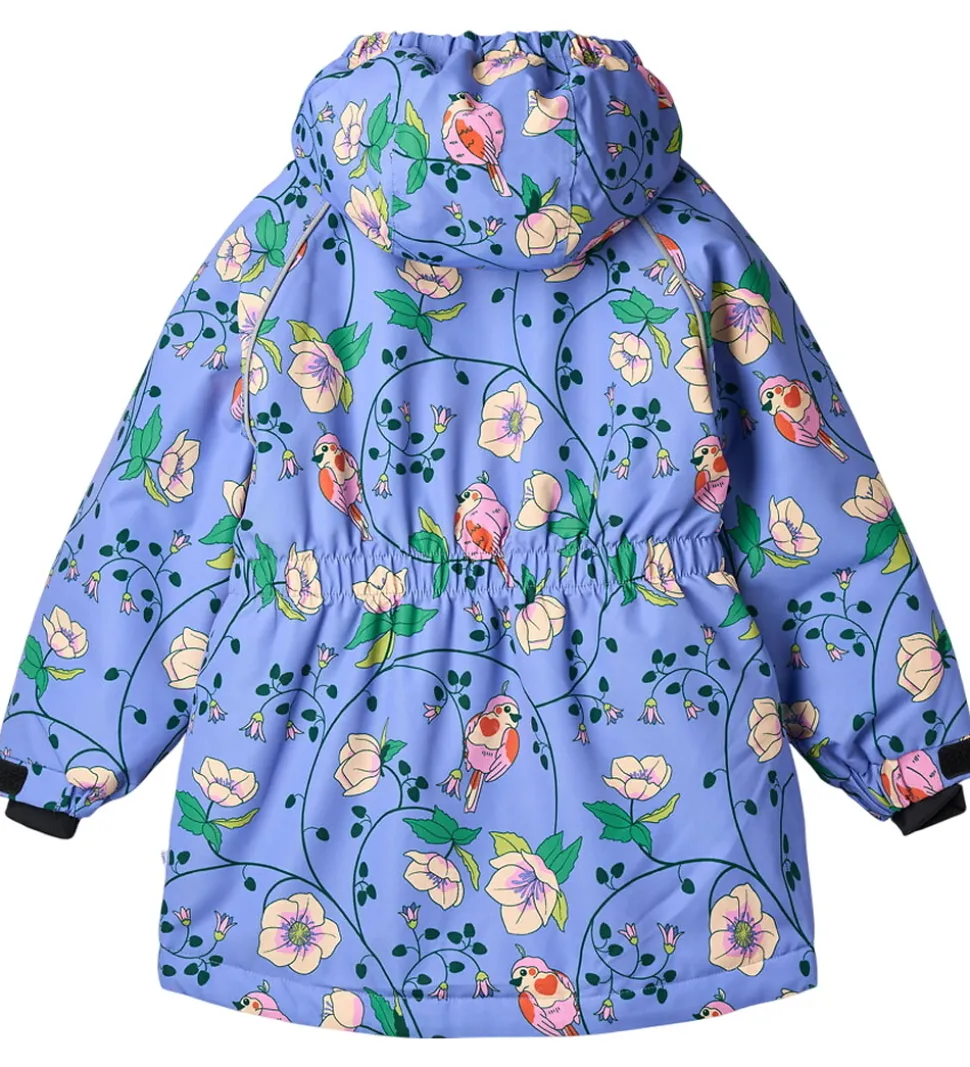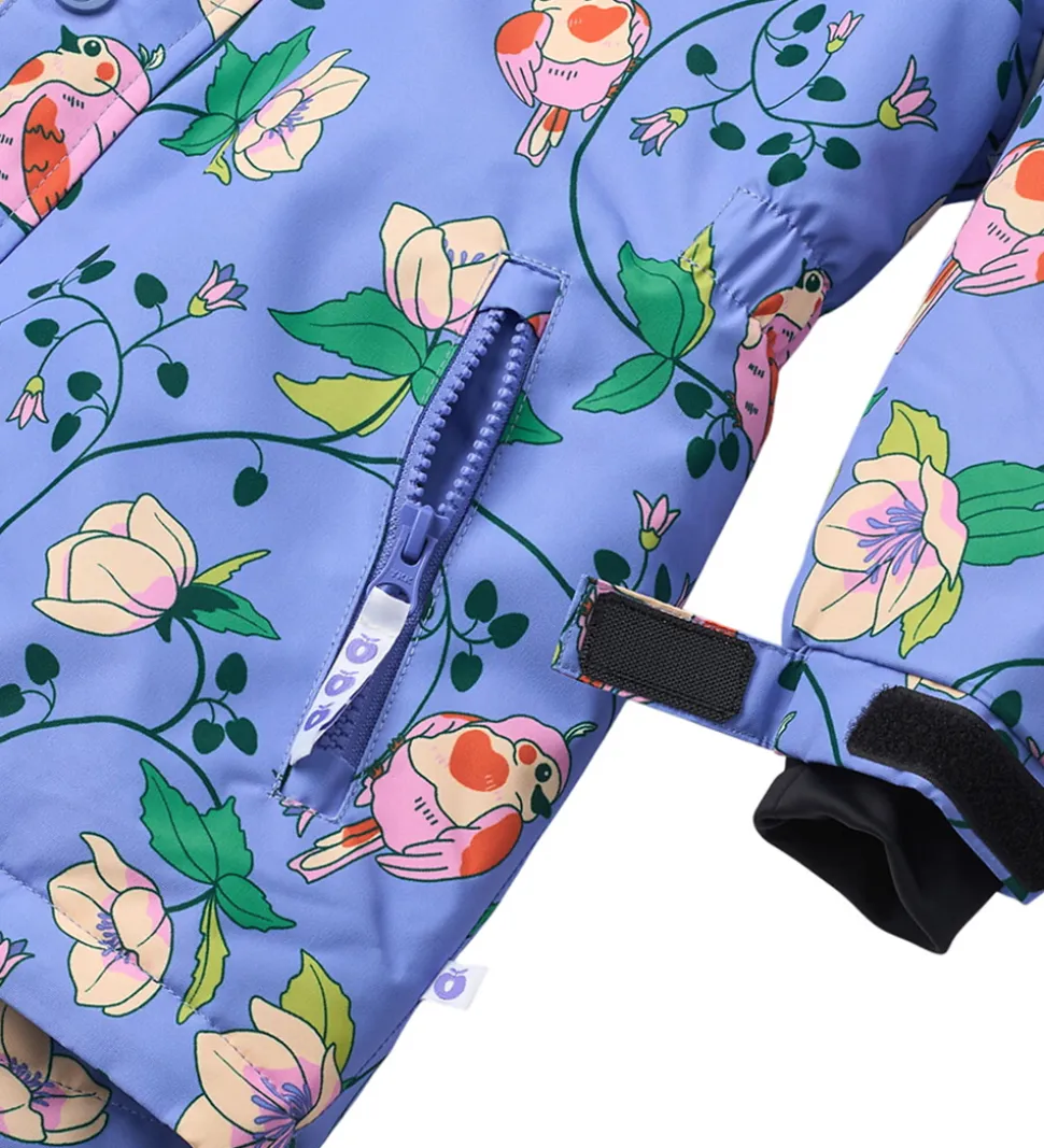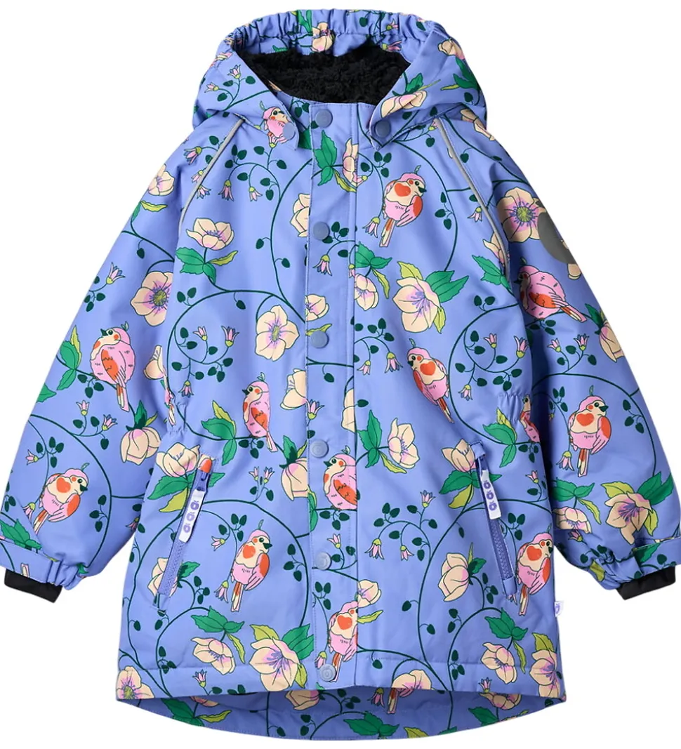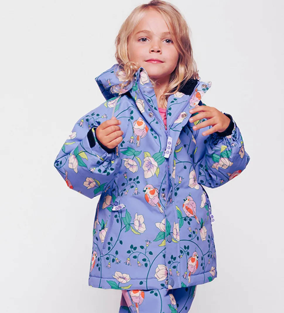 Skøn Småfolk vinterjakke i en smuk lilla nuance med et charmerende blomsterprint og farverige fugle. Rundt om ærmene er der praktiske reflekspipings.