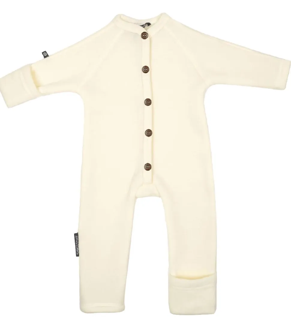 Smallstuff køredragten har lange ærmer og ben, begge med praktiske ombuk så den kan få fødder og luffer. Dragten åbnes fortil med praktiske knapper og indvendigt er der blødt, varmt uldfleece.