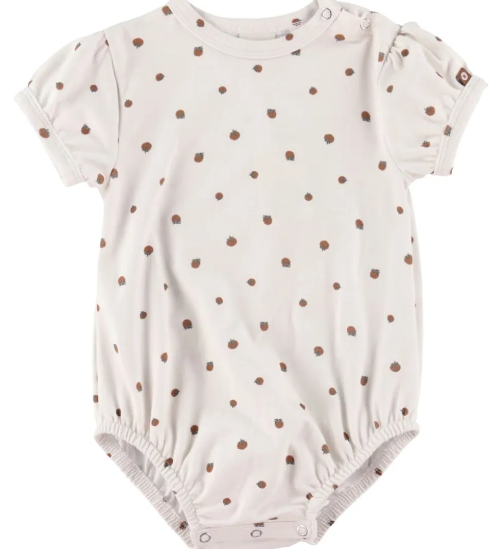 Sød Smallstuff sommerdragt i hvid med allover print af små, røde jordbær.