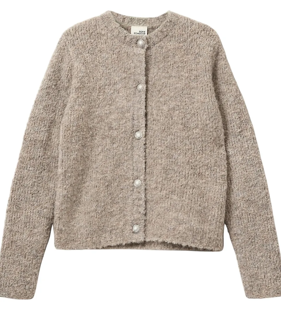 Stilren Sofie Schnoor cardigan i en lys beige, meleret nuance med lange ærmer. Sofie Schnoor cardiganen er strikket med en blød tekstur og har en enkel knaplukning foran. Den har en rund halsudskæring, der giver et klassisk look. Cardiganens design fremhæver en afslappet pasform, der er tydelig i det strikkede materiale.